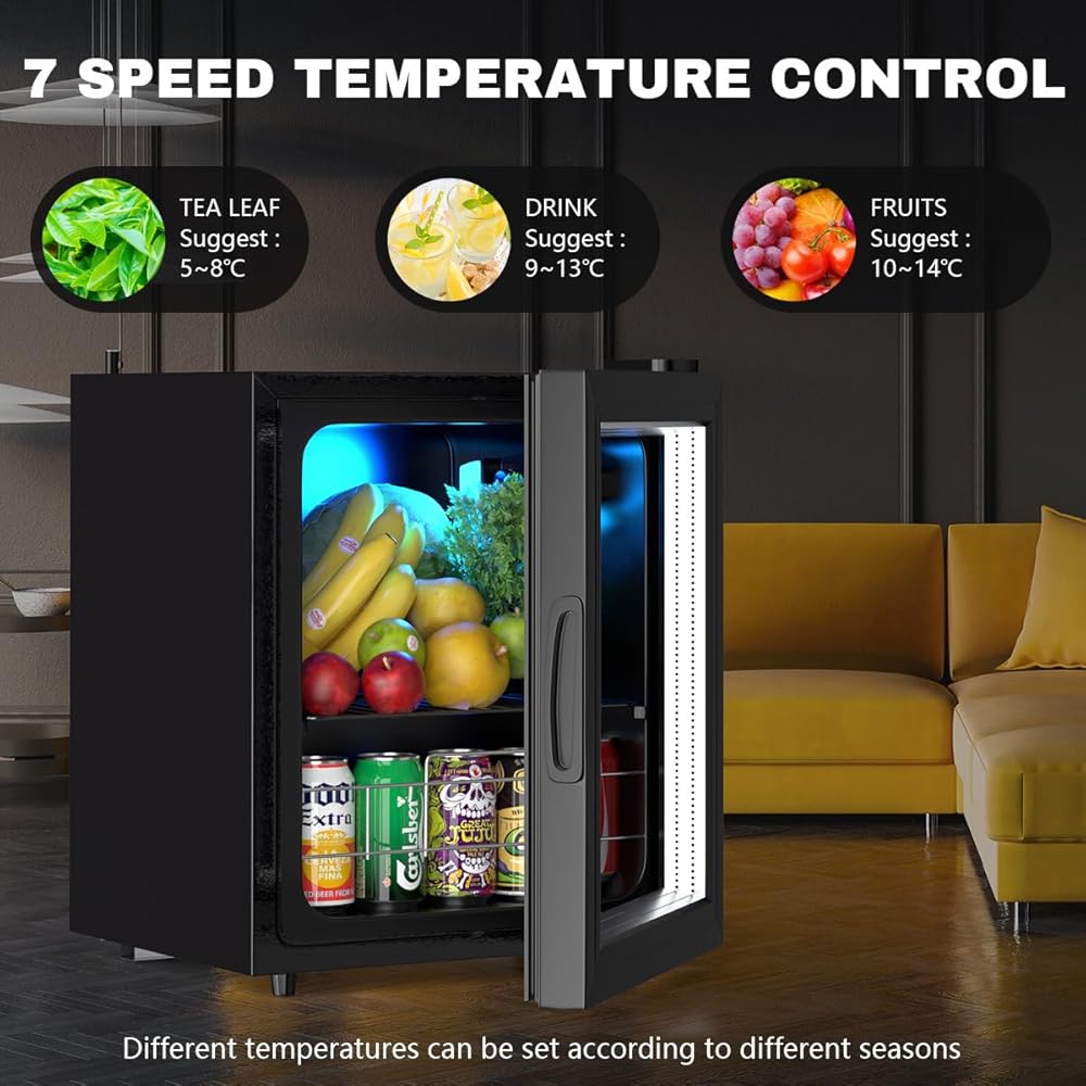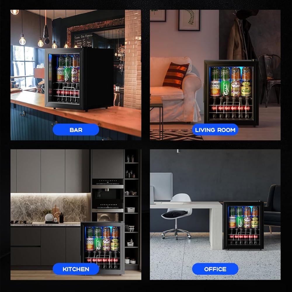 تصميم أنيق: تصميم أنيق باللون الأسود والفولاذ المقاوم للصدأ مع أبواب زجاجية مزدوجة شفافة يمنحك رؤية واضحة لما هي المشروبات الموجودة في الثلاجة. مناسب لأي مكان، مثل المكتب، والمسكن، والشقق، والمركبات الترفيهية، والمطاعم، والمطبخ المنزلي، إلخ.