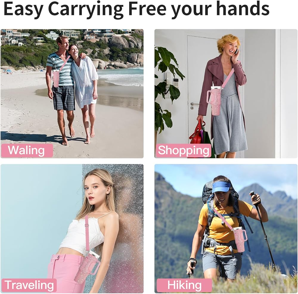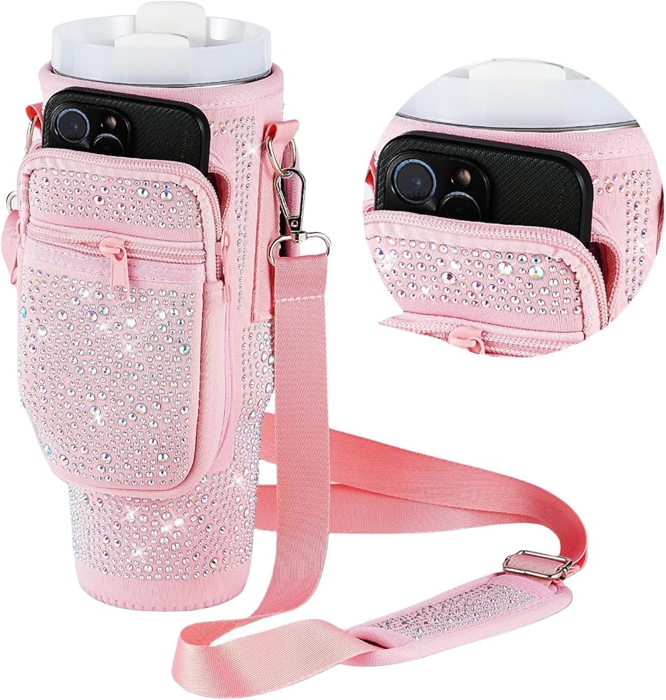 حقيبة حمل زجاجات المياه من جريسورس بلينج لكأس ستانلي 30 أونصة 40 أونصة، حقيبة حامل زجاجة مياه مع حزام كتف قابل للتعديل، جيب للهاتف وغطاء من القش لملحقات كأس ستانلي (وردي)