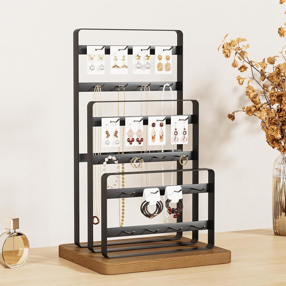 【Perfect Size】: Earring cards display stand measures 9.9'' W × 8.3'' D × 15'' H; Hook length : 1.77" long; Earring card size : 1.77"Wx2.4H". Perfect for displaying jewelry and accessories on tradeshow, showcase, store or personal use.