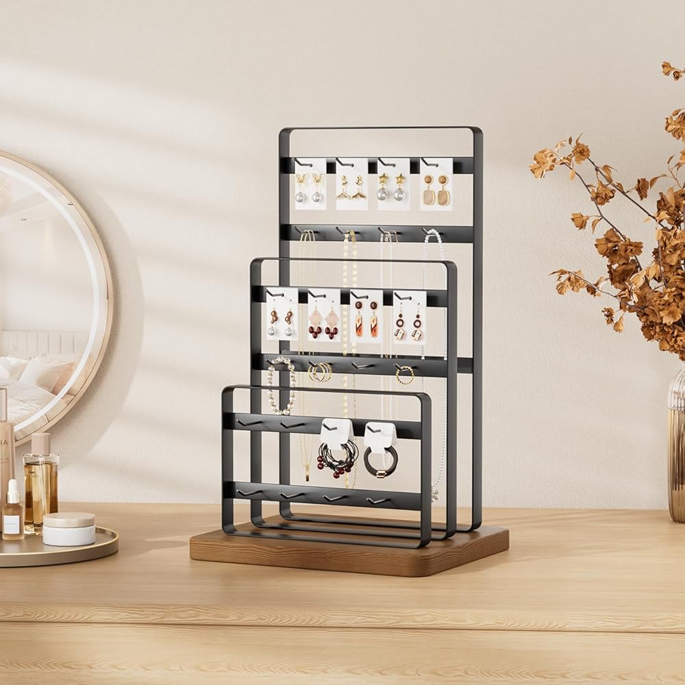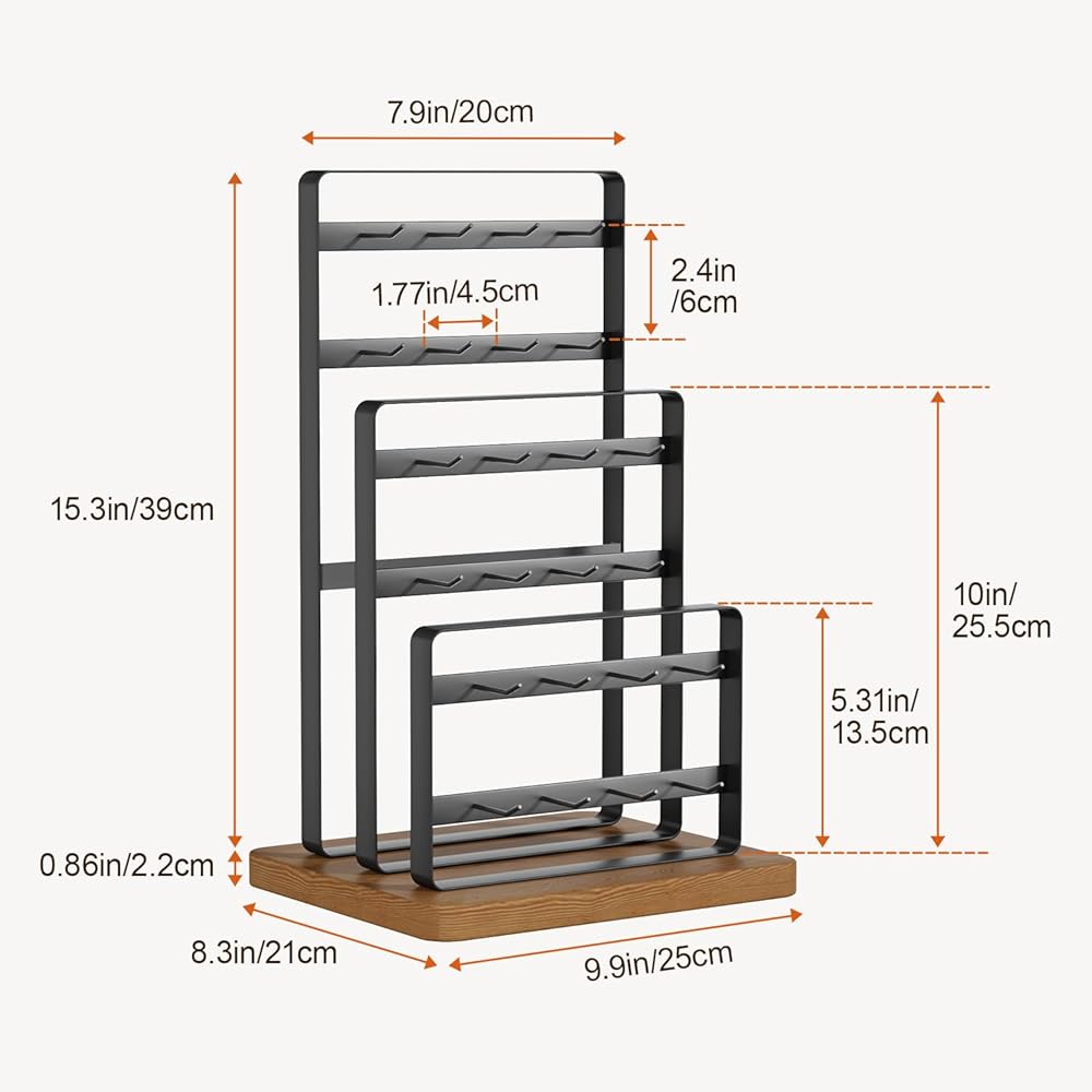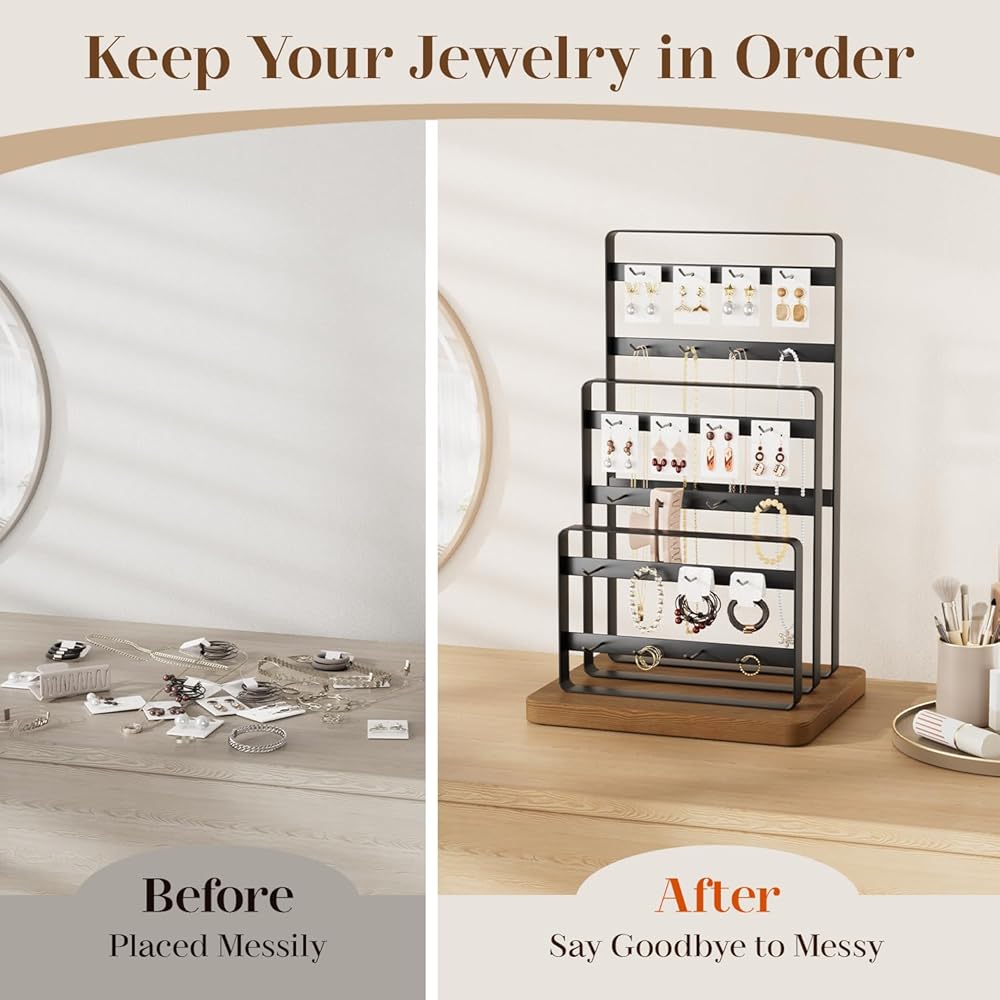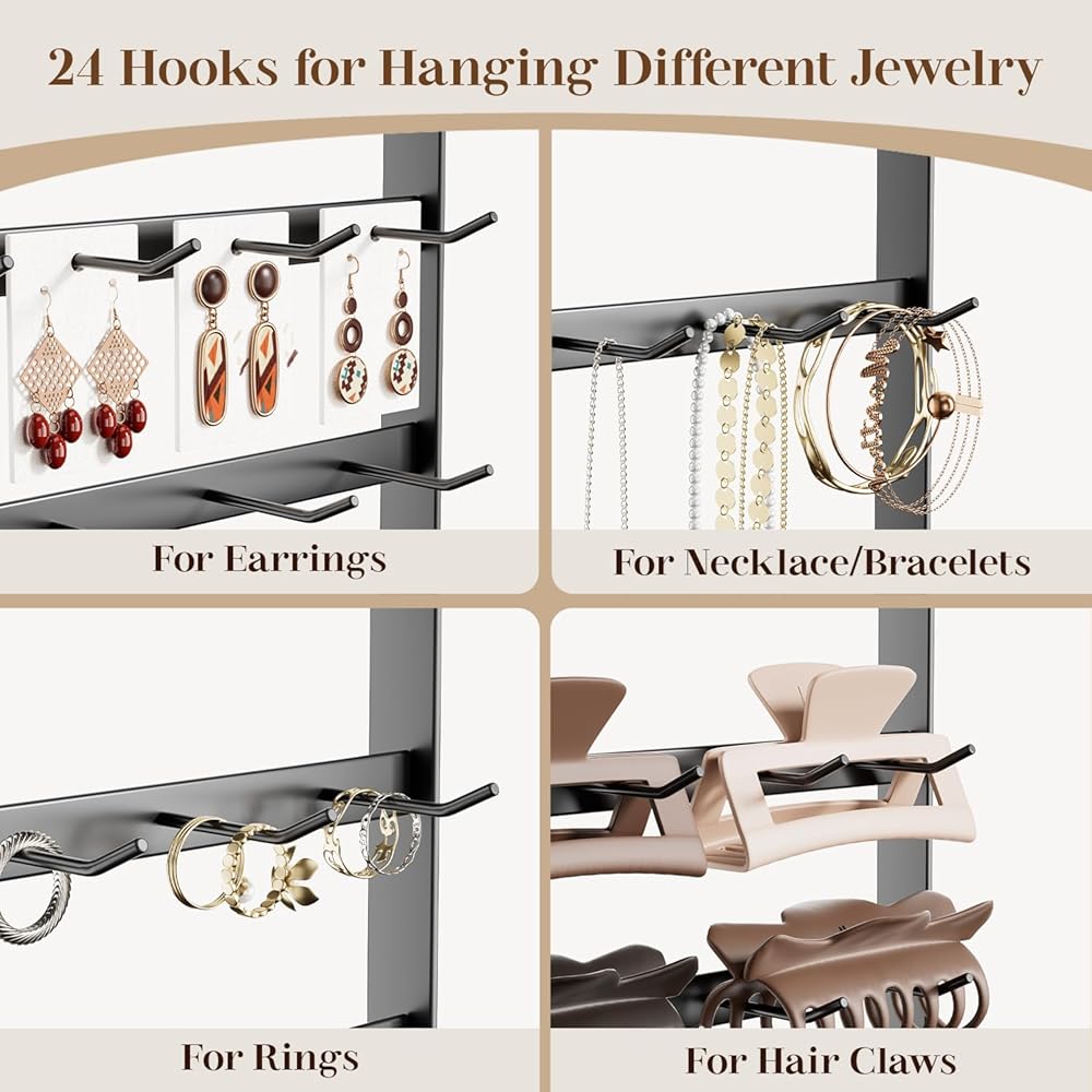 【Earring Display Stand with 24 Hooks】: This earring holder organizer has a total of 6 tiers and 24 hooks for earring, earring cards, bracelets, necklaces, rings, hair claws, hair accessories or keychains.