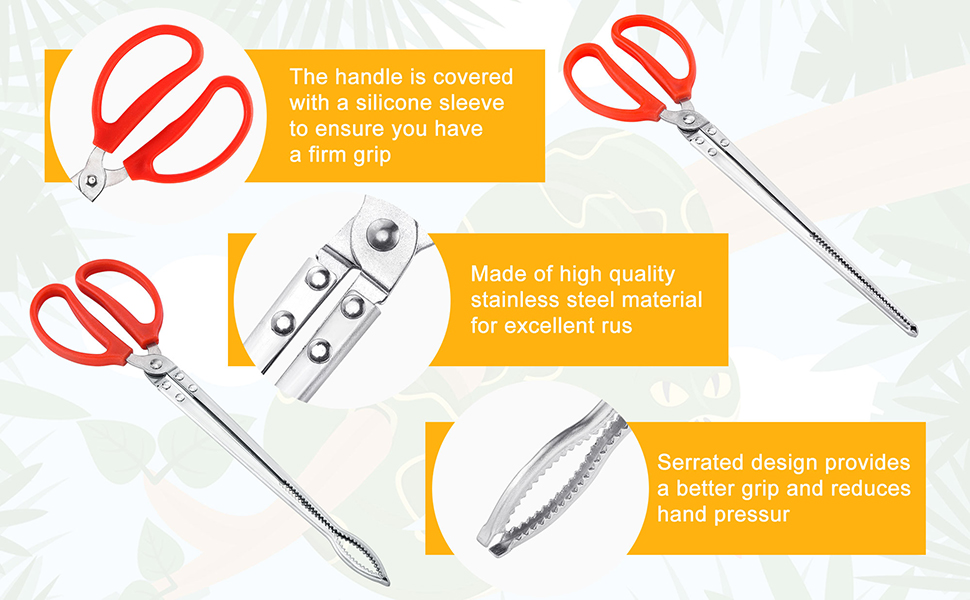تصميم آمن للطول: يبلغ قياس ملقط تغذية الثعبان إجماليًا 14.82 بوصة ويبلغ طول الجزء المسنن 4.29 بوصة، وهو طول كافٍ لضمان المسافة بينك وبين الزواحف لتجنب التعرض للعض.