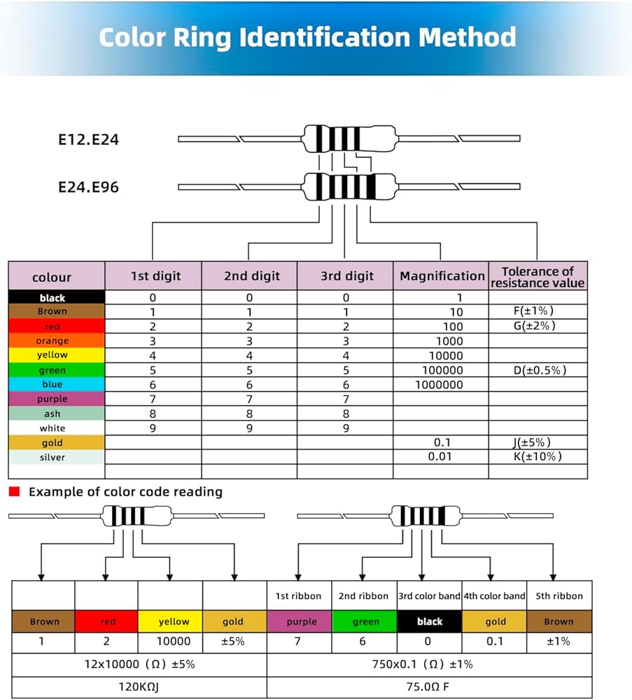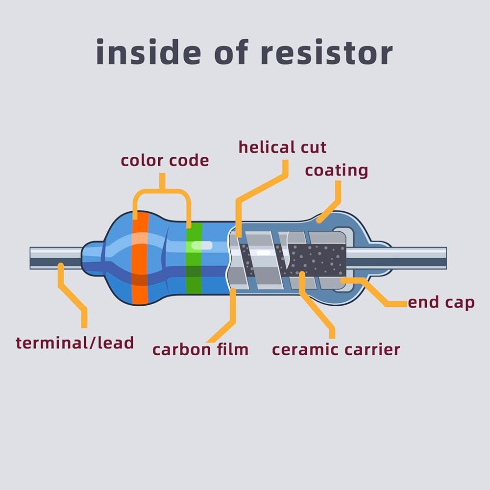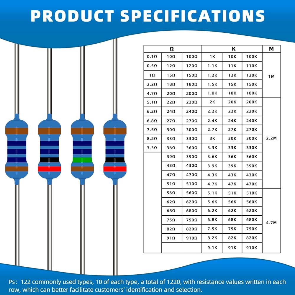 • ترميز الألوان: ترميز شريط الألوان على المقاوم يجعل التعرف على قيم المقاومة سريعًا وبسيطًا، ومناسب للتعلم والتجريب.