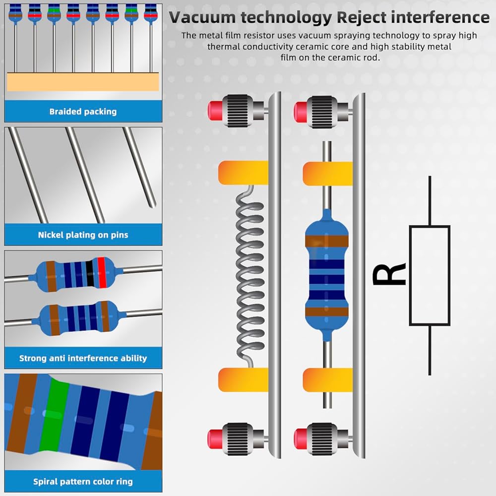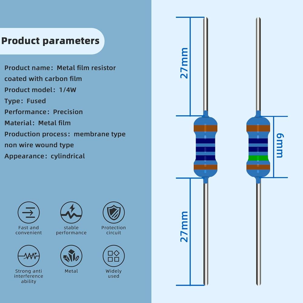 • أداء عالي الدقة: كل مقاوم مصنوع من طبقة كربونية أو معدنية، مما يوفر ثباتًا ودقة ممتازين، ومناسب لتصميم الدوائر الدقيقة.