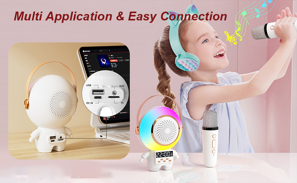 • 【تصميم رائد فضاء وميكروفونات مزدوجة】: آلة الكاريوكي الصغيرة بتصميم رائد فضاء الأحلام الحديثة وميكروفونين لاسلكيين. يستخدم ميكروفون كاريوكي اللاسلكي أحدث تقنيات النقل اللاسلكي لنقل صوتك بكفاءة. عند تشغيل كل من مكبر الصوت والميكروفون، يتصل الميكروفون تلقائيًا ويتمتع بنطاق تشغيل يصل إلى 33 قدمًا. تقنية ذكية متقدمة لتقليل الضوضاء، معالج صوت DSP احترافي، إلغاء الصوت الأصلي بنقرة واحدة