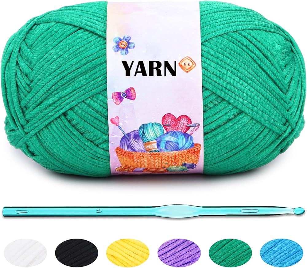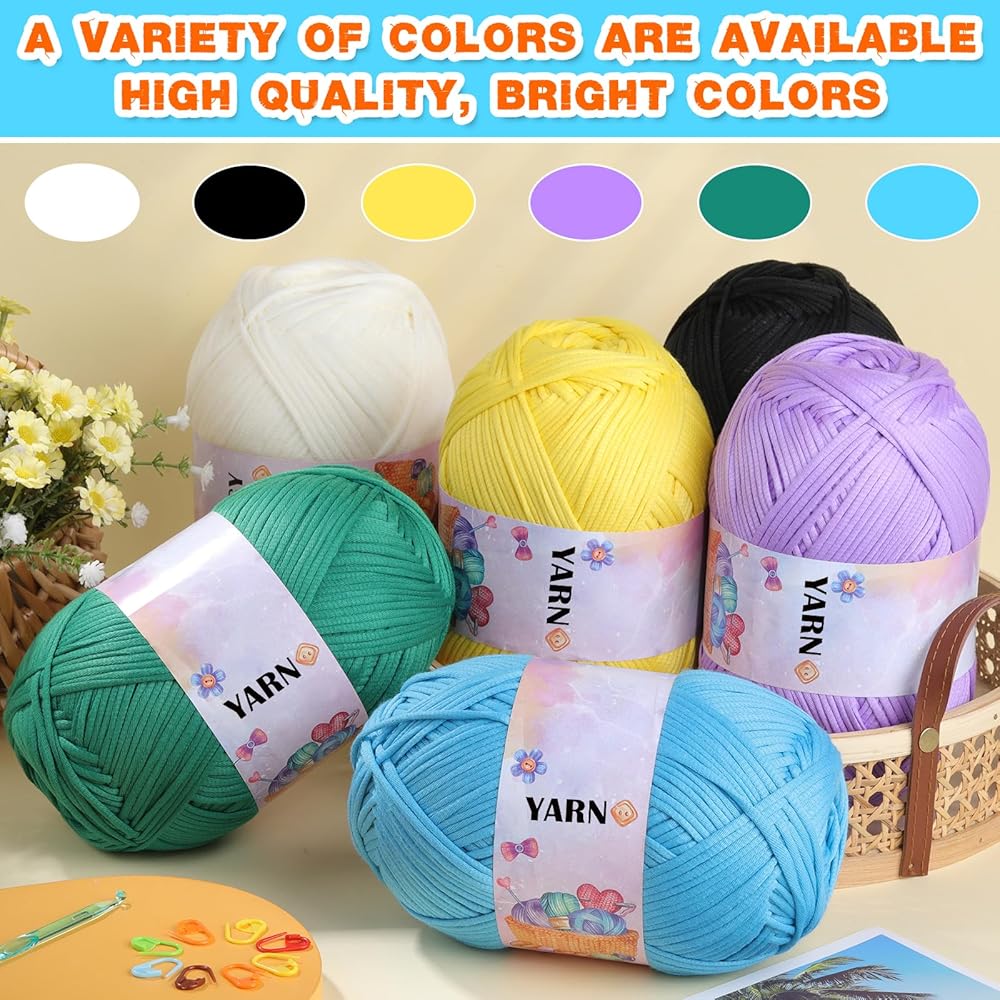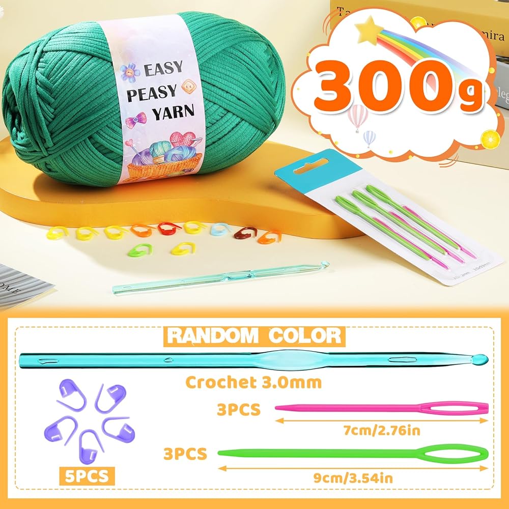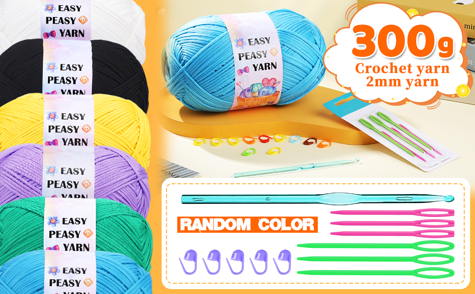 مجموعة خيوط الكروشيه: تتضمن لفة غزل 300 جرام، 1 خطاف كروشيه شفاف (3 مم)، 6 إبر بلاستيكية كبيرة العين (7 سم × 3,9 سم × 3)، 10 علامات غرز (لون عشوائي)، مجموعة كروشيه أساسية.