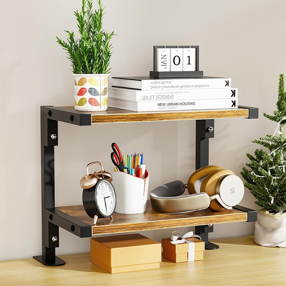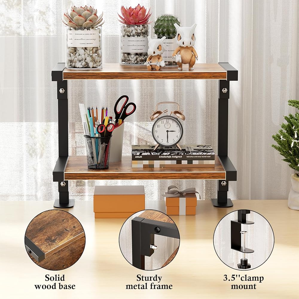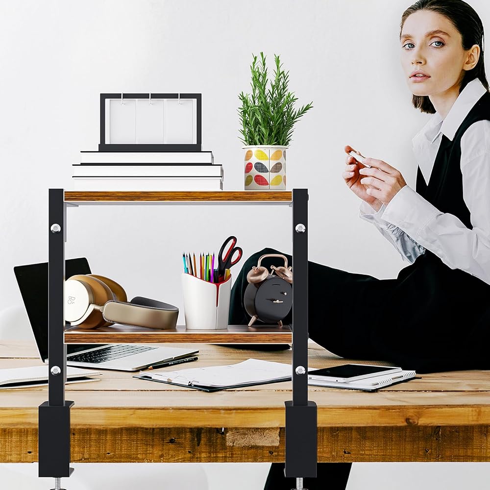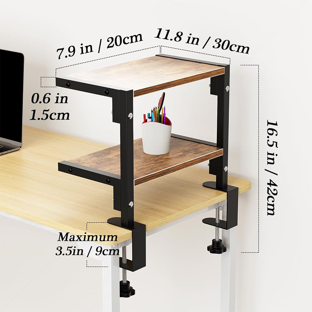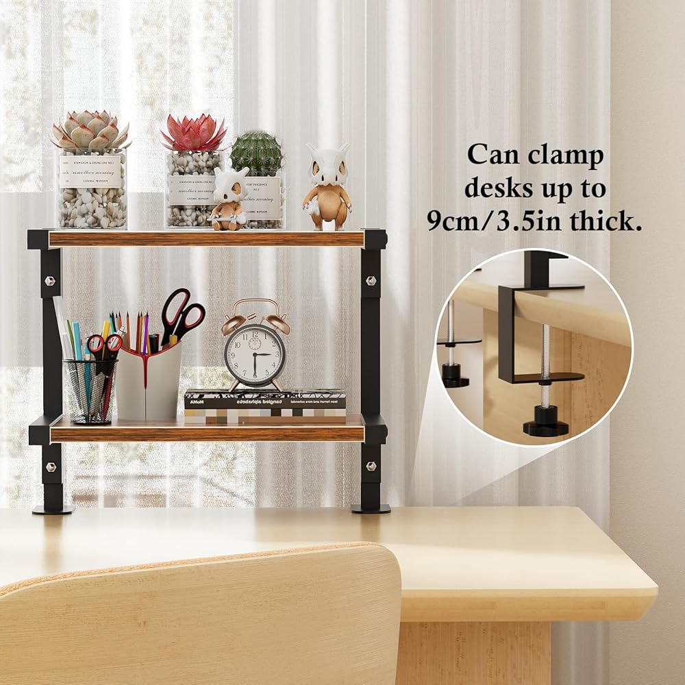 mopam المشبك على رف المكتب منظم موسع سطح المكتب بطبقتين، رف تخزين خشبي مقاس 12 بوصة مثبت فوق أو أسفل حامل عرض سطح المكتب وحدة رفوف رف الكتب المكتبي لسطح الطاولة