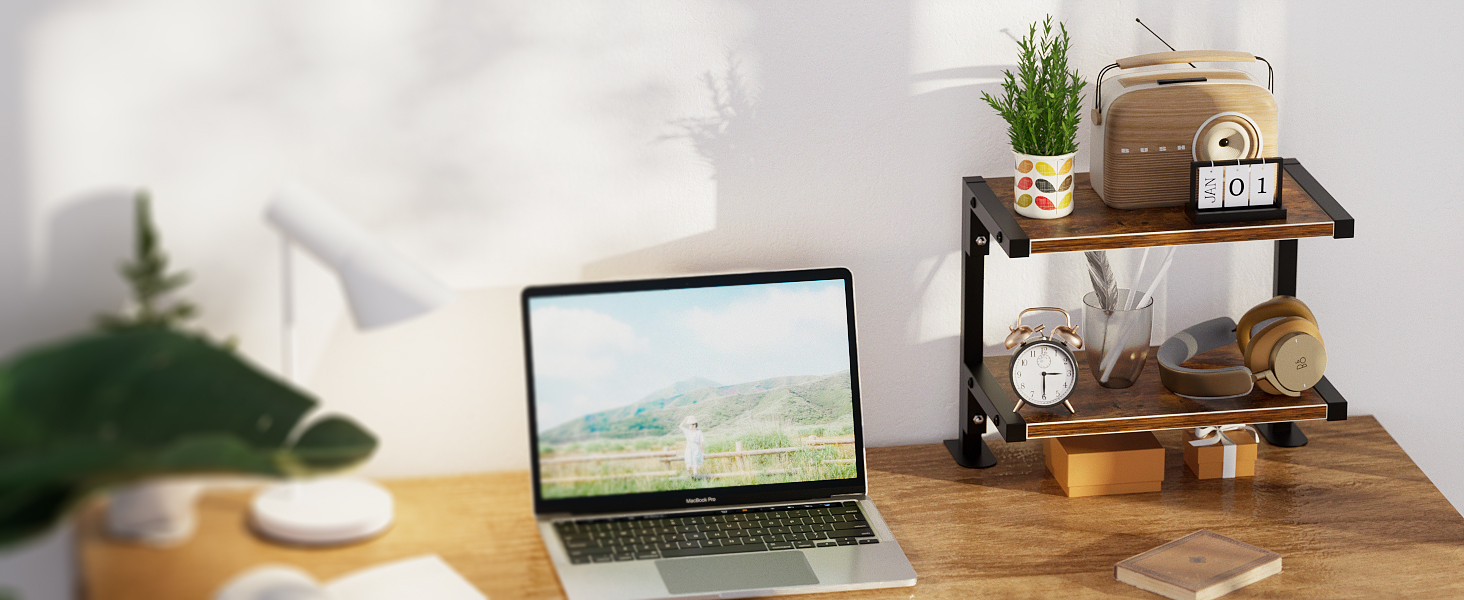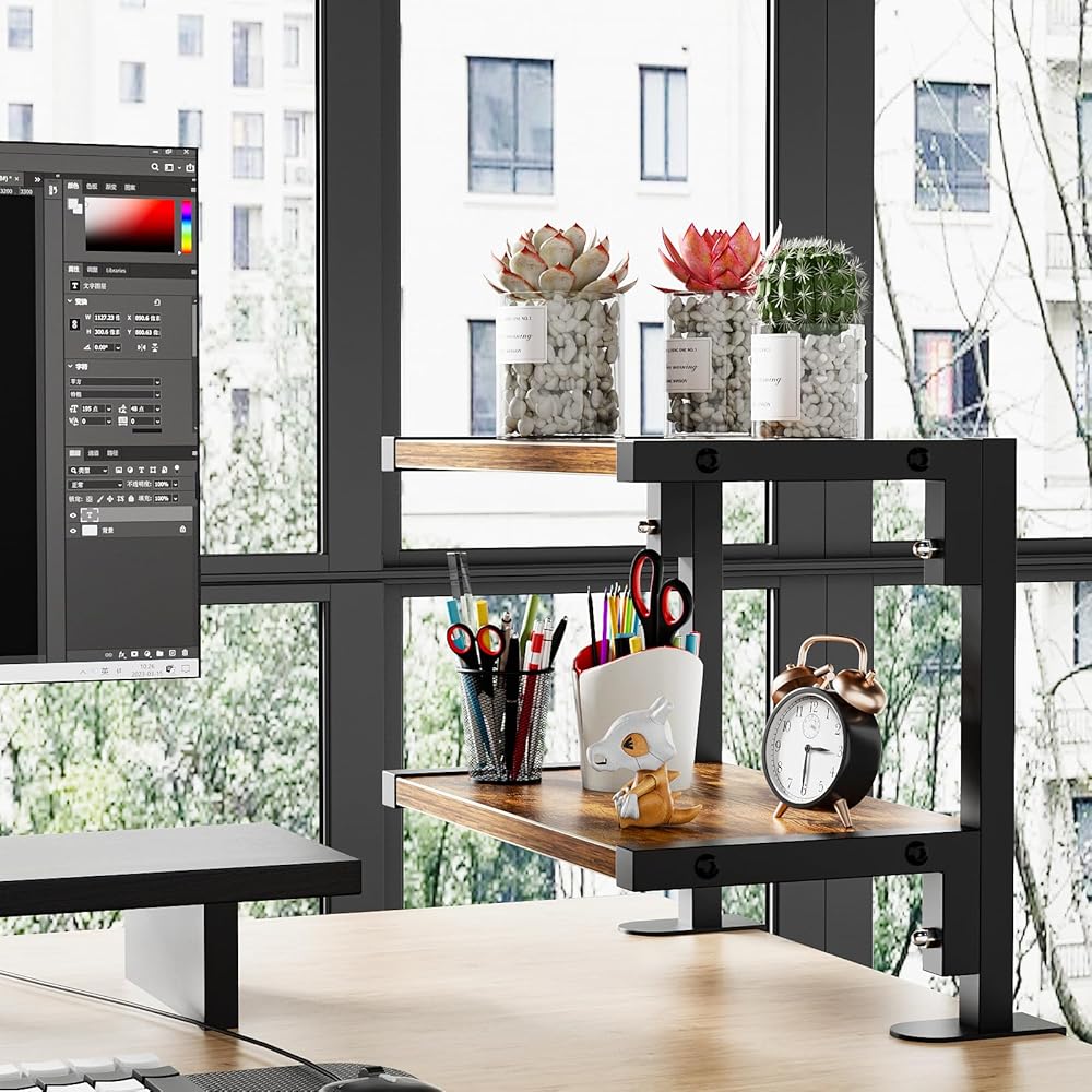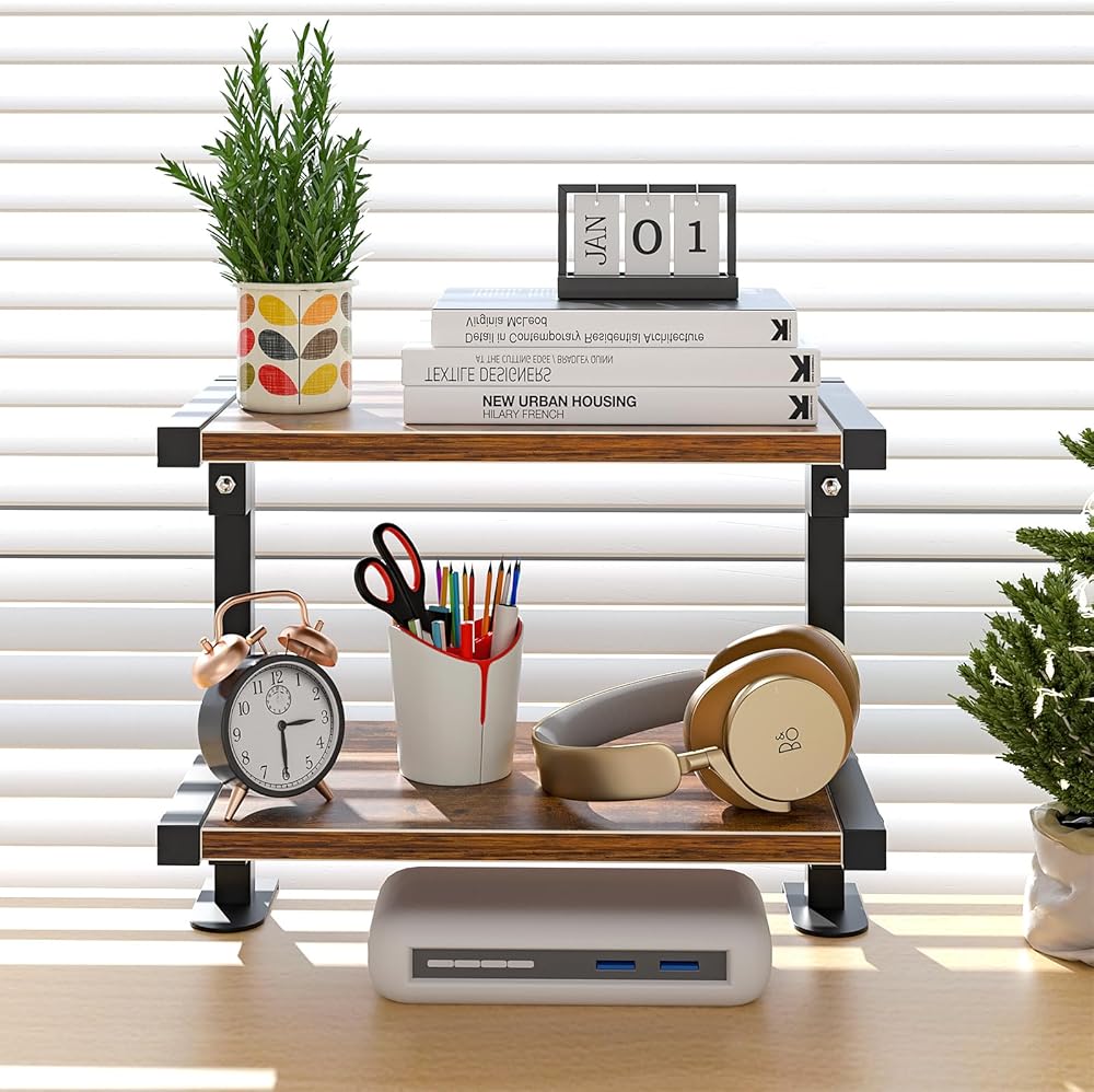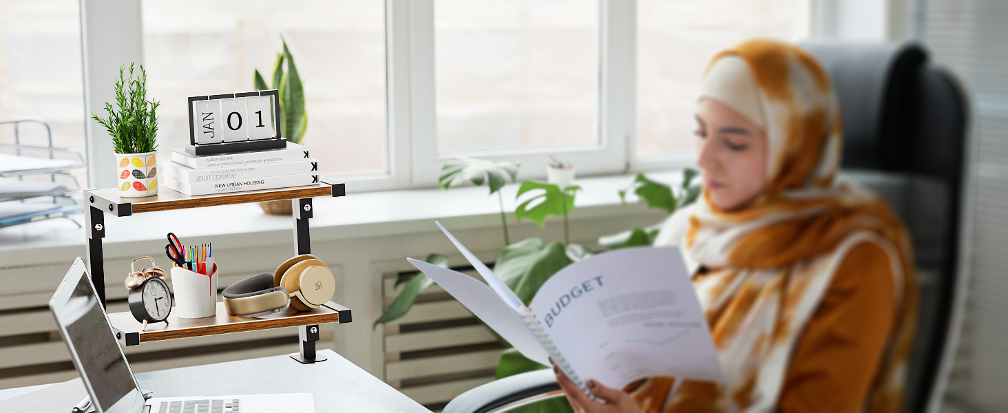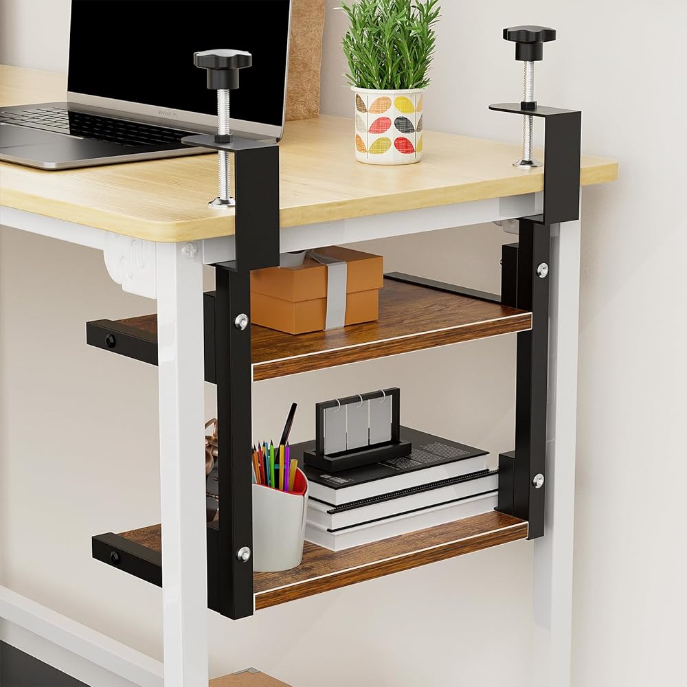 mopam المشبك على رف المكتب منظم موسع سطح المكتب بطبقتين، رف تخزين خشبي مقاس 12 بوصة مثبت فوق أو أسفل حامل عرض سطح المكتب وحدة رفوف رف الكتب المكتبي لسطح الطاولة