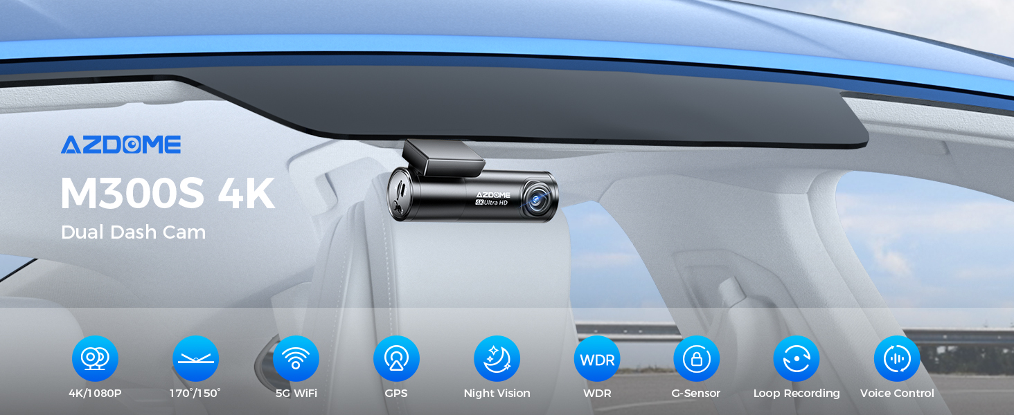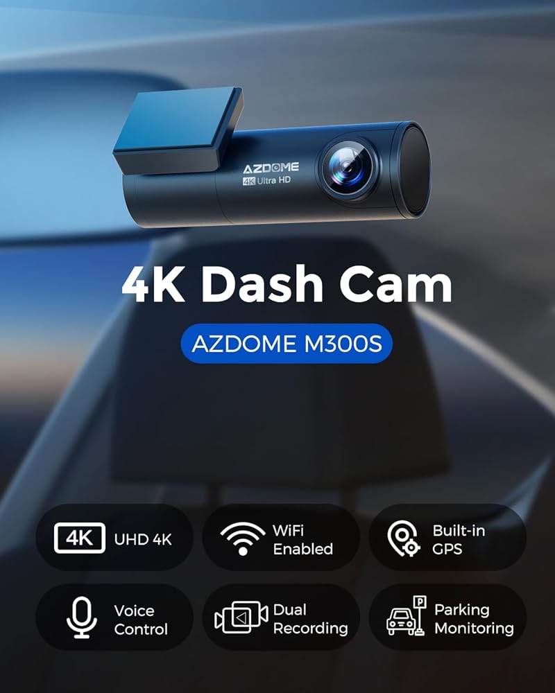 AZDOME 4K Dash Cam 5G WiFi GPS، WDR Super Night Vision Camera للسيارة، مستشعر G، وضع وقوف السيارات، بطاقة SD مجانية 64 جيجابايت، كاميرا Dashcam بزاوية واسعة 170 درجة، تسجيل حلقة، التحكم الصوتي M300S