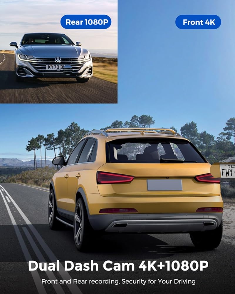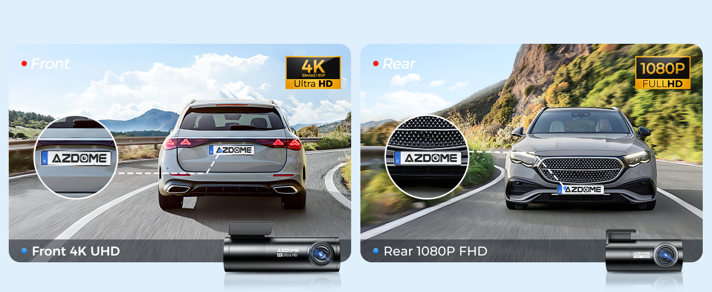 كاميرا Dash Cam ثنائية القناة: تسجل كاميرا Dash Cam الأمامية والخلفية من AZDOME فيديو بدقة تصل إلى 4K (3840*2160P)+1080P، مما يضمن التقاط لوحات الترخيص وعلامات الطريق وأي تفاصيل مهمة أخرى بدقة.