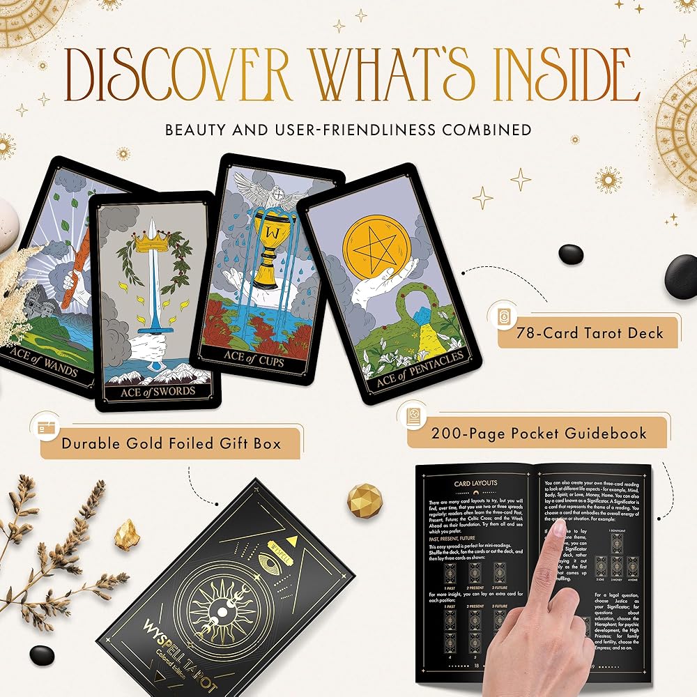 Wyspell Modern Tarot - بطاقات التارو الفريدة مع كتاب دليل للمبتدئين - سطح التارو من رقائق الذهب مع كتاب دليل - مجموعة بطاقات التارو الذهبية للمبتدئين مع كتاب بطاقات التارو