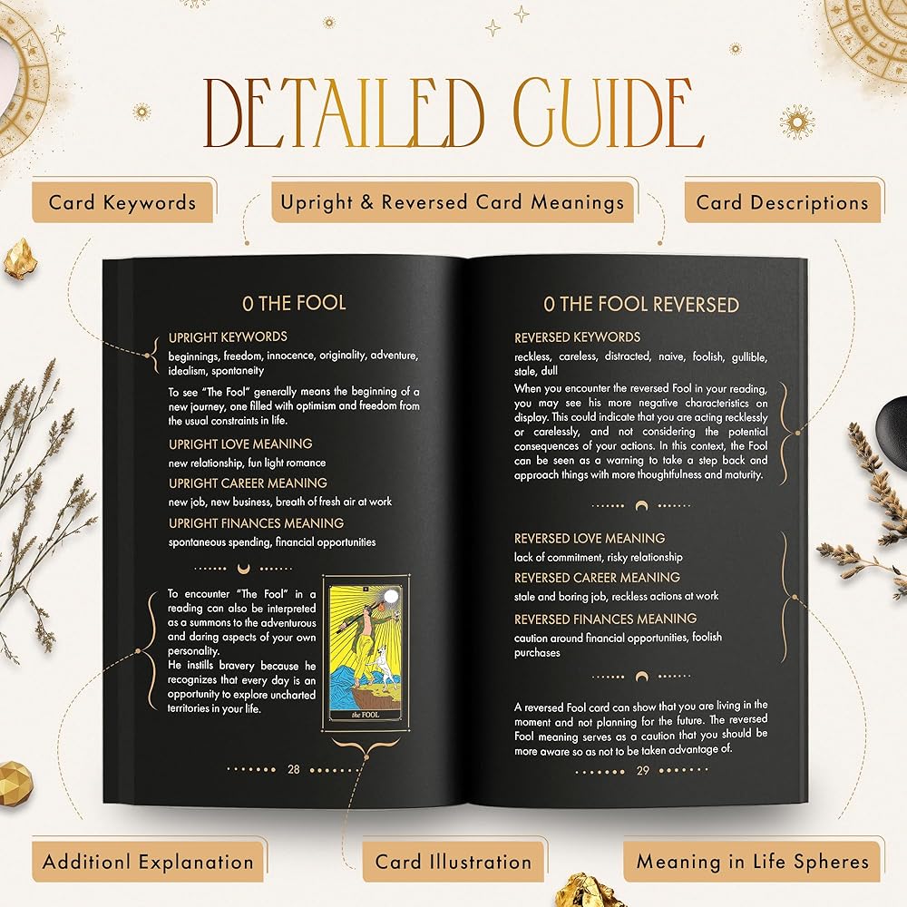 • دليل شامل لبطاقات التارو للمبتدئين: انغمس في أسرار مجموعة التاروت التقليدية من خلال دليل بطاقات التارو المكون من 200 صفحة. استكشف الشروحات التفصيلية لبطاقات التارو للمبتدئين، والفروقات المتنوعة، والتفسيرات في الحب، والوظيفة، والمجالات المالية