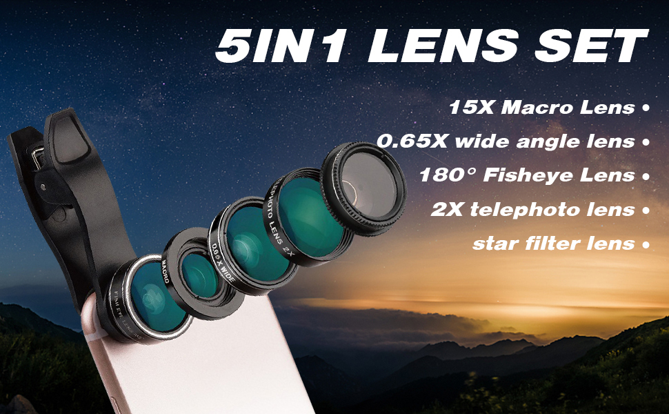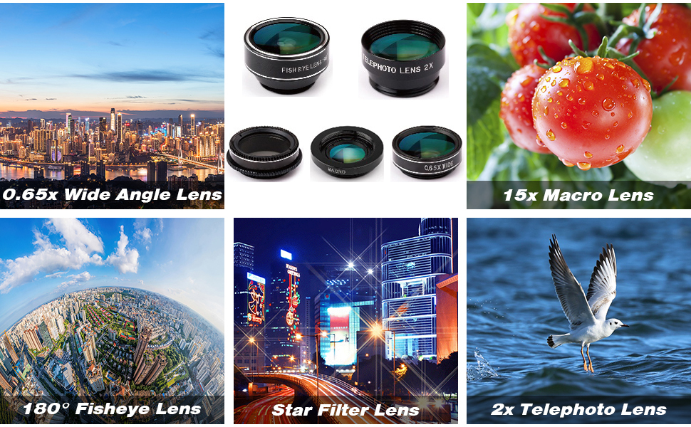 【متضمنة: عدسة زاوية واسعة 0.65x، عدسة ماكرو 15X، عدسة عين السمكة 180 درجة، عدسة تليفوتوغرافي 2X، عدسة فلتر النجوم، قطعة قماش للتنظيف، غطاء عدسة × قطعتين، مشبك. يتم تخزين جميع العناصر بشكل منفصل وبشكل أنيق في العبوة. الحجم الصغير يجعلها سهلة الحمل ومريحة للحمل إلى أي مكان في أي وقت والعثور على عالم جديد.