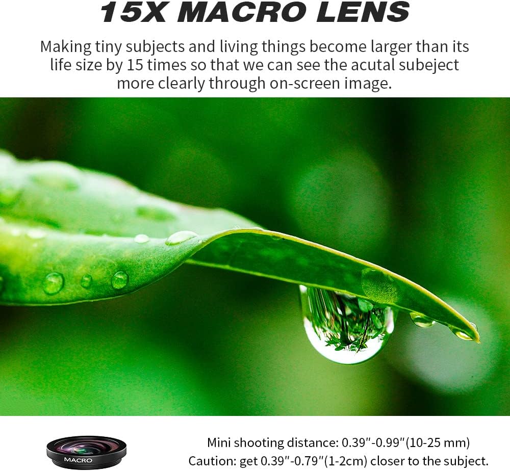 【عدسة ماكرو 12X】تكبير الموضوعات القريبة للحصول على صور مذهلة. تستخدم عادةً لالتقاط صور للتفاصيل الصغيرة مثل القطرات والزهور والحشرات. التقط جميع التعقيدات والتفاصيل مع التركيز الدقيق للحصول على صور ماكرو واضحة للغاية. ضع العدسة على بعد 25 مم إلى 40 مم من الجسم، ثم التقط صورًا مقربة مفصلة كما لم تتخيلها من قبل.