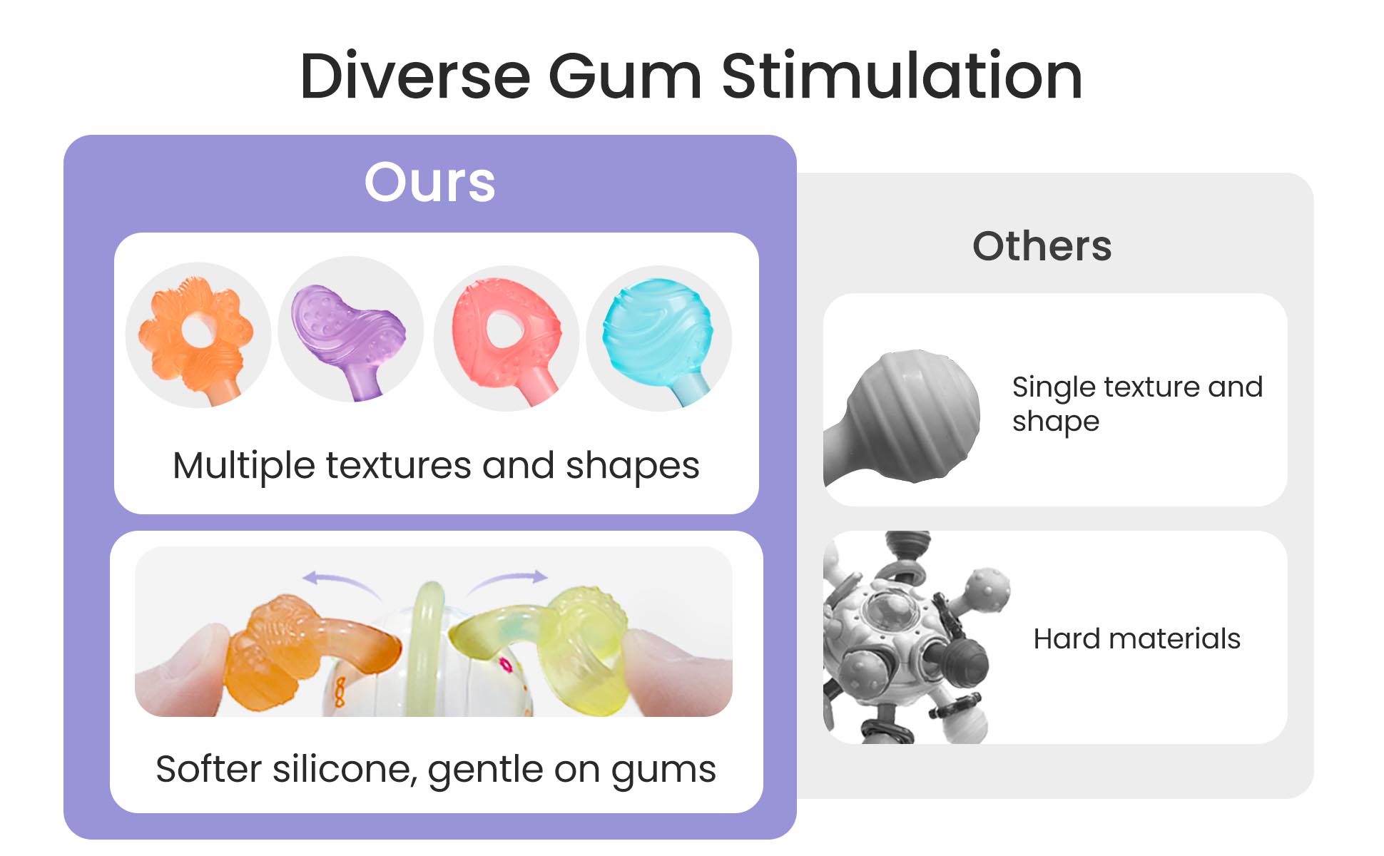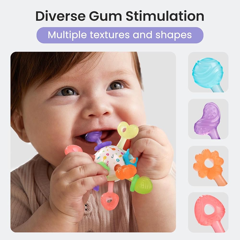 【تحفيز مختلف للثة】مقارنة بألعاب التسنين العادية ذات النسيج الواحد، تتميز عضاضتنا بمجموعة متنوعة من الأشكال والأنسجة، مما يوفر للأطفال تجربة تحفيز لثة أكثر تنوعًا خلال مراحل التسنين المختلفة. مصنوع من السيليكون الناعم، وهو لطيف على اللثة، ويوفر راحة مهدئة ويعزز النمو الصحي للفم. يجب أن يكون للأطفال الذين تتراوح أعمارهم بين 0-12 شهرا.