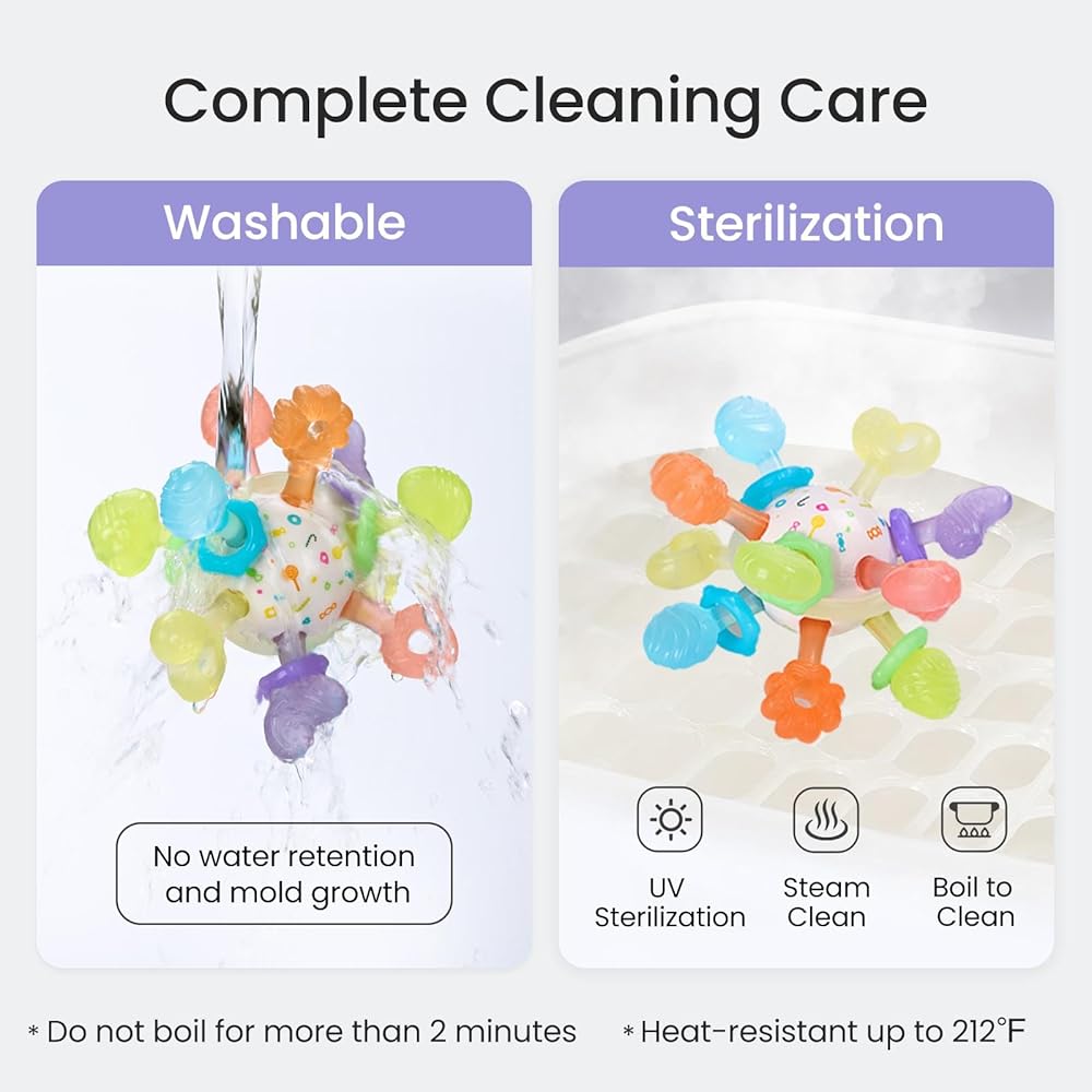 【العناية بالتنظيف الكامل】يمكن شطف لعبة عضاضة الأطفال هذه بسهولة بالماء، والكرة المركزية محكمة الغلق، مما يمنع احتباس الماء. مصنوعة من مواد مقاومة للحرارة، وتتحمل درجات حرارة تصل إلى 212 درجة فهرنهايت للغليان، مما يضمن تجربة مضغ نظيفة للأطفال. بالإضافة إلى ذلك، فهي تأتي مع صندوق تخزين للوقاية من الغبار والأوساخ، مما يجعلها مريحة للحمل. يخفف من إزعاج التسنين لدى الطفل في أي وقت وفي أي مكان! يرجى ملاحظة أن هذه العضاضة ليست آمنة للاستخدام في غسالة الأطباق أو الميكروويف. لا تغلي لأكثر من دقيقتين.