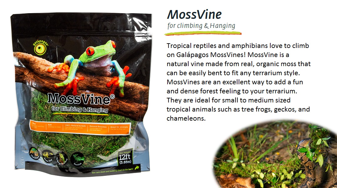 Galapagos Moss Vine is for Climbing and Hanging. It is ideal for Red Eye Tree Frogs, Chameleons, Arrow Frogs, Barking Tree Frogs, Basilisks and similar climbing species. It comes in a 6FT length and resealable bag.