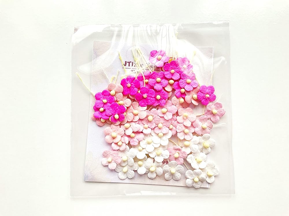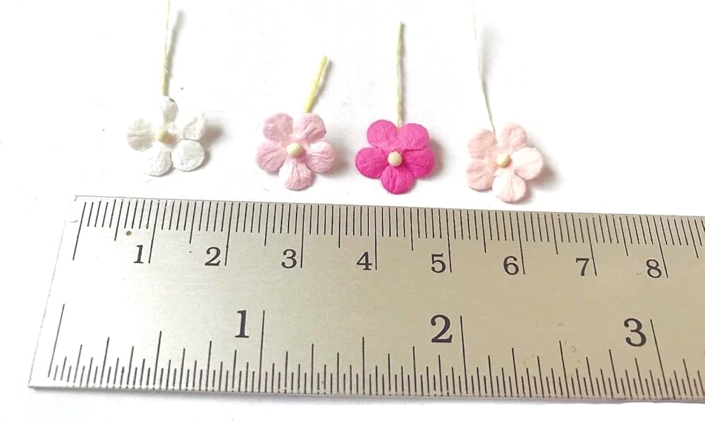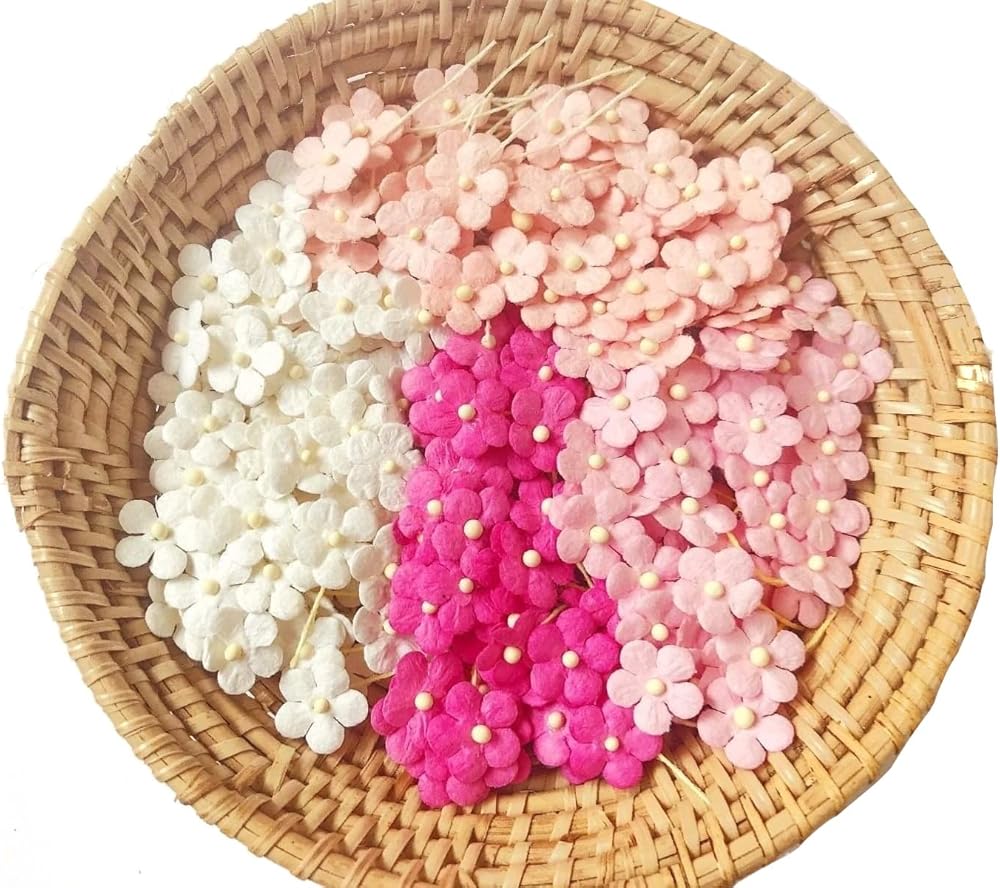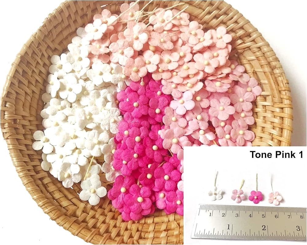 PLFlower set of 50 Tiny Flower Mixed Tone Pink Embellishment with Thread stem Mulberry Paper Flower size 0.30" Very small Pink1 Craft Handmade Wedding Scrapbook for so Many Card Craft Projects