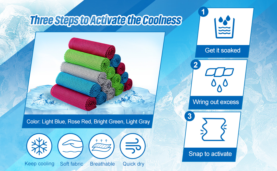 أغطية الرقبة المبردة متعددة الاستخدامات: مناشف التبريد للرقبة والوجه يمكن أن تبرد جسمك بسرعة؛ عندما تنقعه في الماء، وتعصره، وتغلقه، سوف يبرد على الفور ويظل باردًا لمدة تصل إلى ساعتين، لذلك يمكنك وضعه حول رقبتك.