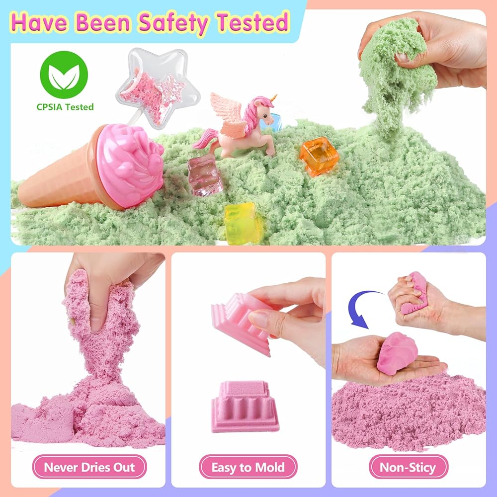 رمل اللعب السحري: رمل اللعب السحري سهل التشكيل وغير لزج وغير جاف، ويمكن للأطفال استخدام أفكارهم بالكامل لحفر الرمل والضغط عليه وتشكيله. قل وداعًا لوقت اللعب الفوضوي مع صندوق الرمل المزود بغطاء. إنها توفر مساحة للعب في الداخل، كما أنها سهلة التنظيف. بالإضافة إلى ذلك، فهو بمثابة حل تخزين مريح، مما يضمن أن وقت اللعب جاهز دائمًا للانطلاق.