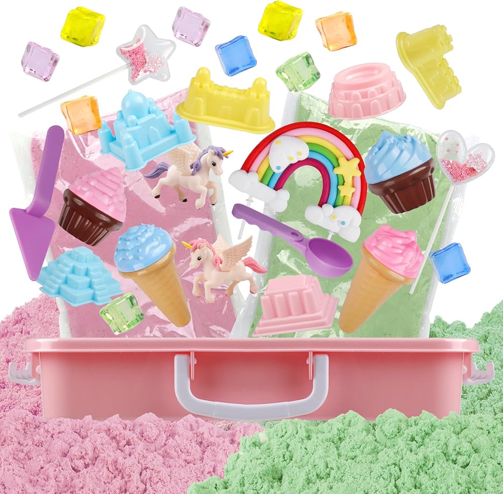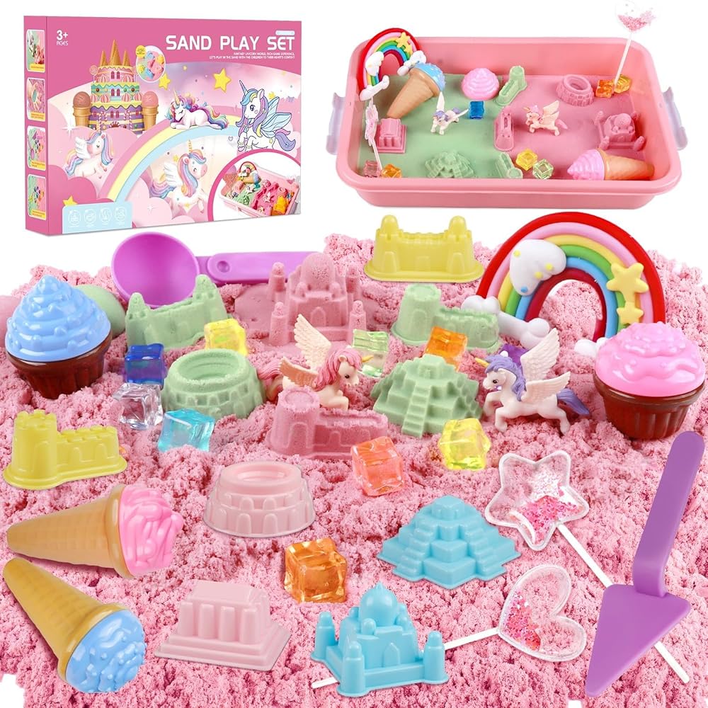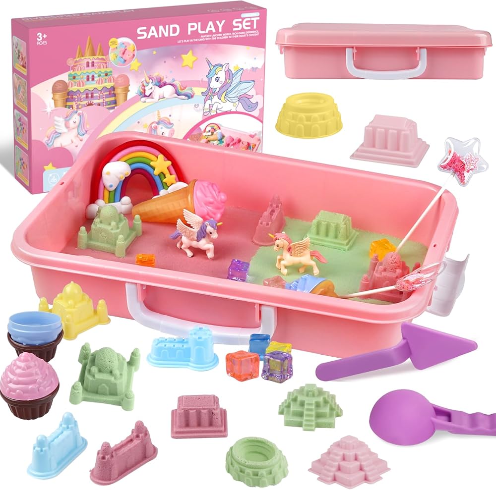 صندوق يونيكورن الحسي: توفر مجموعة اللعب الرملية وحيد القرن للأطفال تجربة مبهجة ذات طابع أحادي القرن، مصممة لإثارة الخيال وإلهام اللعب العملي. تشتمل المجموعة على صندوق تخزين بغطاء، و2.2 رطل (1 كجم) من رمل اللعب ومجموعة من الملحقات ذات الطابع أحادي القرن. من الأحجار الكريمة اللامعة إلى أقواس قزح الجميلة ووحيدات القرن، فإن إمكانيات اللعب الخيالي لا حصر لها.