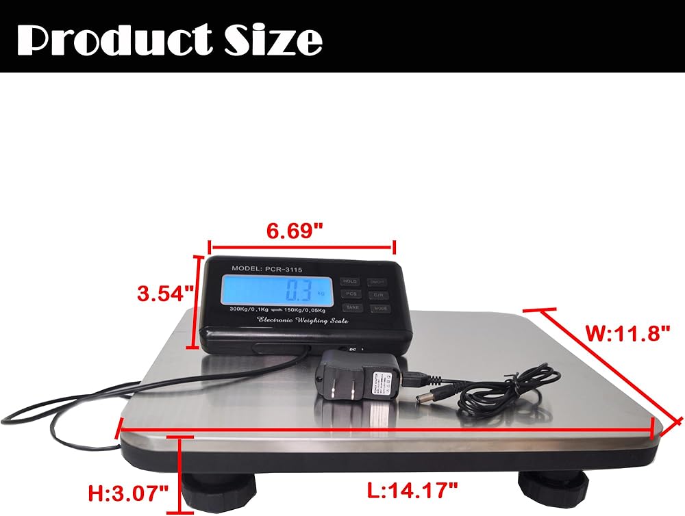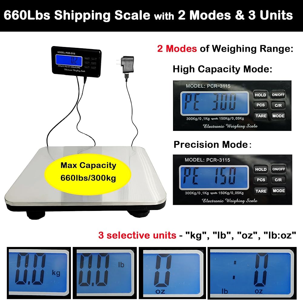 سعة كبيرة 660 رطل/300 كجم مع 3 وحدات ووضعين: السعة القصوى: 660 رطل/300 كجم، السعة الدنيا: 1.1 رطل/0.5 كجم؛ 3 وحدات اختيارية - يمكنك الضغط على زر الوضع للتبديل إلى "كجم"، و"رطل"، و"أونصة" للقراءة؛ وضع السعة العالية ووضع الدقة - اضغط على زر C/R لتغيير الأوضاع