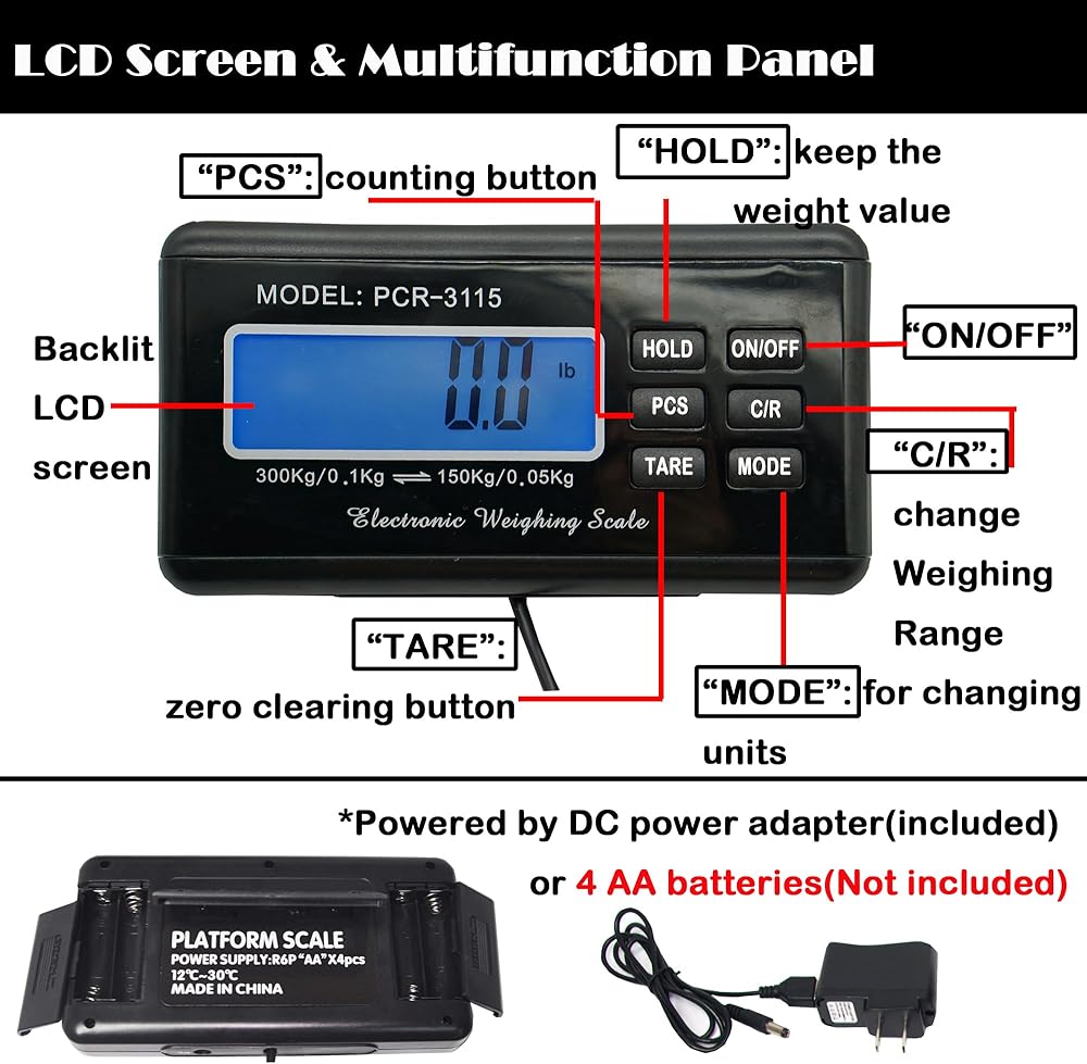 شاشة LCD ولوحة متعددة الوظائف: يمكن عرض الوزن في الوقت الحقيقي من خلال شاشة LCD ذات الإضاءة الخلفية بوضوح. لوحة تشغيل تحتوي على 6 أزرار لوظائف الوزن المختلفة؛ يمكن تشغيل الميزان بمحول طاقة تيار مستمر (متضمن) أو 4 بطاريات AA (غير متضمنة)، وسيتم إيقاف تشغيله تلقائيًا موفرًا للطاقة عند تشغيله بالبطارية.