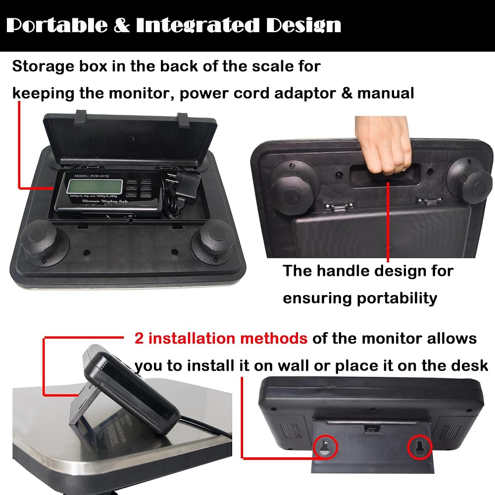 تصميم محمول ومتكامل: صندوق تخزين في الجزء الخلفي من الميزان لحفظ الشاشة ومحول سلك الطاقة والدليل؛ طريقتان للتركيب تسمح لك بتثبيته على الحائط أو وضعه على المكتب؛ تصميم المقبض لضمان سهولة الحمل