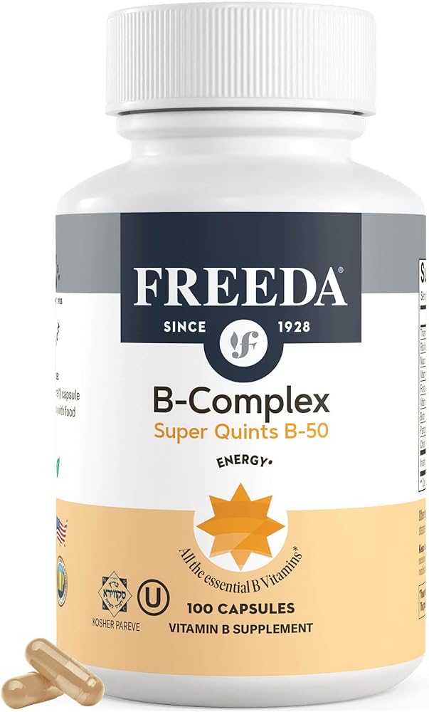 مركب فيتامين ب من فريدا - سوبر كوينتس ب-50 - مكمل فيتامين ب مركب سوبر بي للنساء والرجال مع فيتامين ب1 وفيتامين ب2 وفيتامين ب3 وفيتامين ب6 وفيتامين ب12 بالإضافة إلى حمض الفوليك، 100 كبسولة