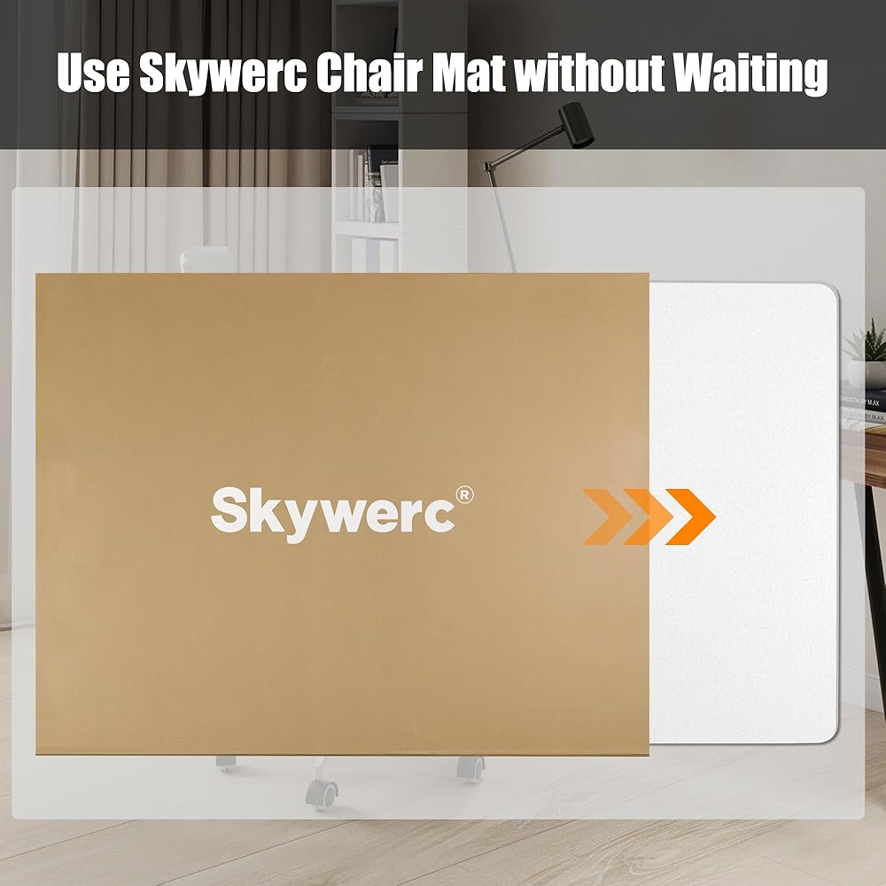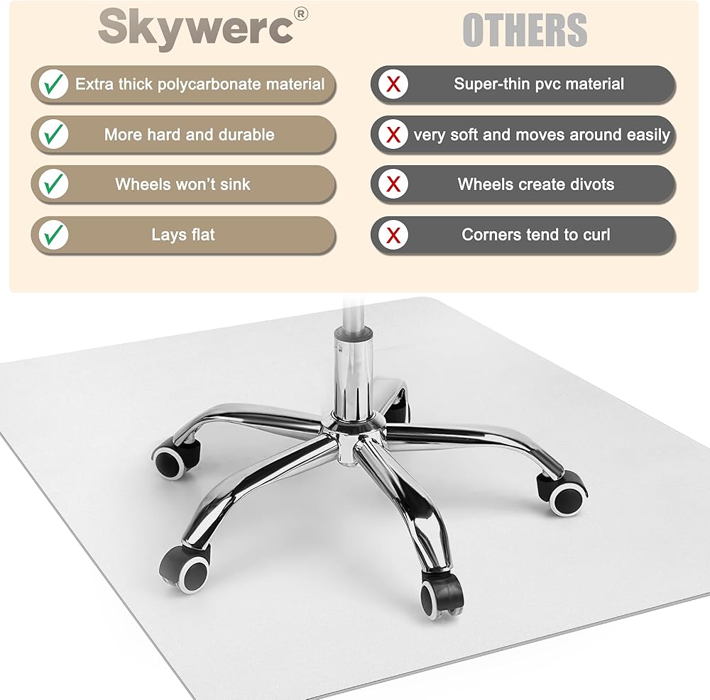 👍خامة فاخرة: يتم إنتاج سجادات كراسي المكتب عالية التحمل من Skywerc من البولي كربونات بنسبة 100% للحصول على أقصى درجات الأداء والمتانة. بغض النظر عن المناخ، فإن كرسي مكتبك أو كرسي الألعاب الخاص بك لن يسبب انبعاجات، بل سيبقى مسطحًا تمامًا طوال الوقت!