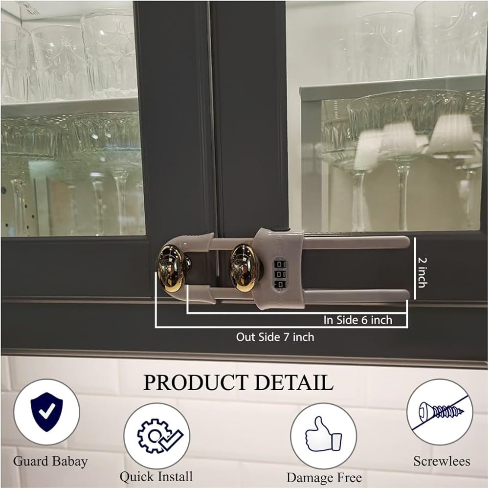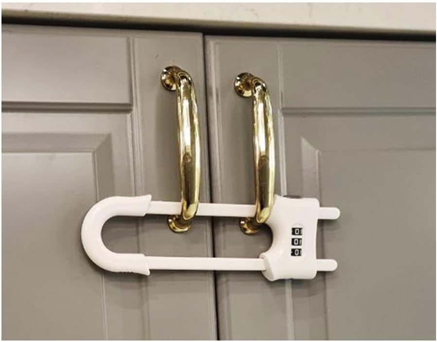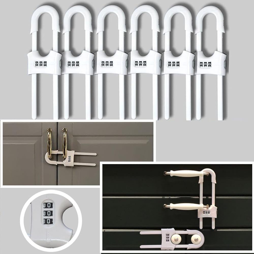 أقفال خزانة منزلقة مقاومة للأطفال مع مجموعة مكونة من 3 أرقام - مزالج أمان على شكل حرف U للأدراج والخزائن، سهلة التركيب، بدون مثقاب - قابلة للتعديل للمقابض والمقابض، 6 عبوات