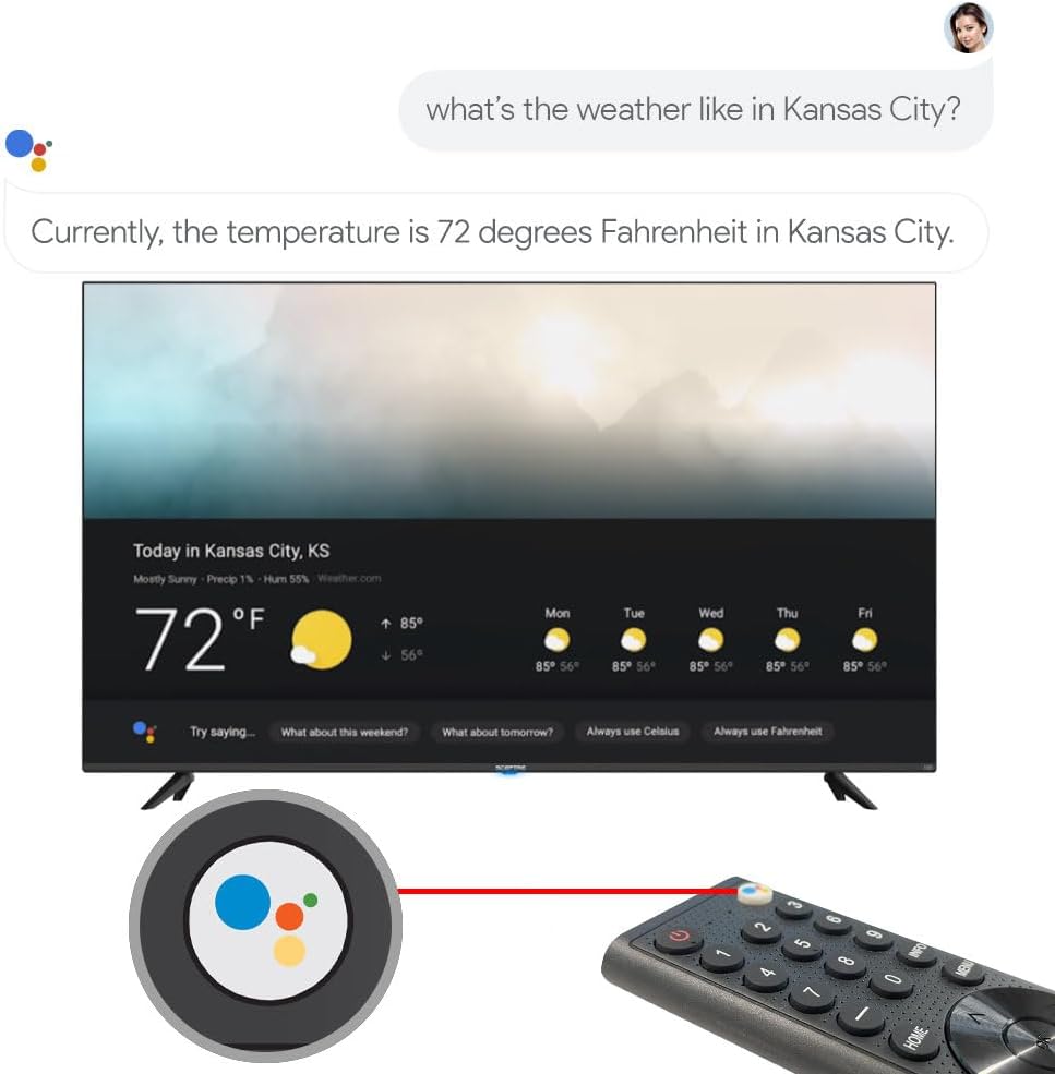 Google Assistant Whether you require step-by-step instructions during the set-up process, or an authority to chime in occasionally to figure out a feature, Google Assistant is always there for you. Simply say "Ok Google" or click the mic button on the remote, and Google Assistant will answer your questions and rapidly navigate features for you.
