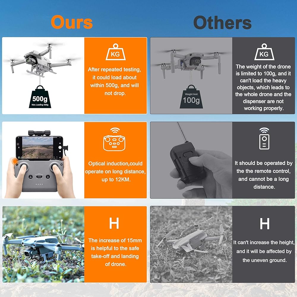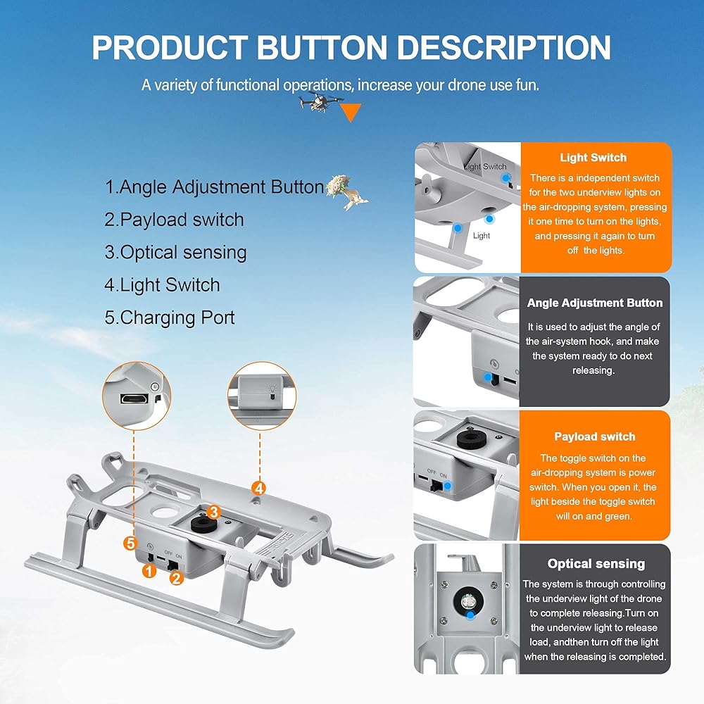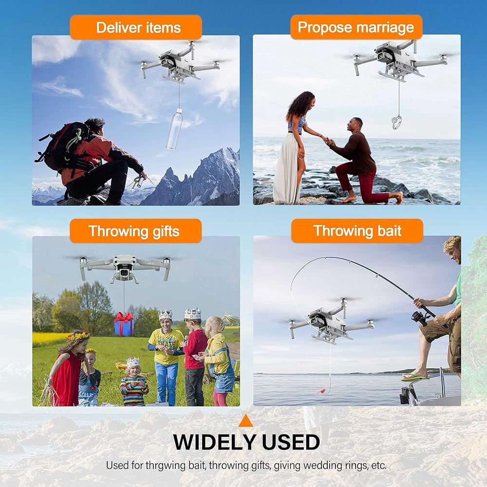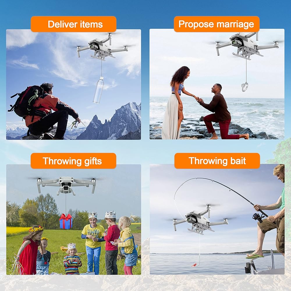 【سهلة التركيب】 يتم تثبيت الحزام على الجهاز، ويتم محاذاة الجهاز مع الفتحة السفلية للطائرة بدون طيار وثابت. يدور الحزام حول الجزء العلوي من الطائرة بدون طيار ويمر عبر فتحة الجهاز، ثم يتم شده وتثبيته. مناسبة لسيناريوهات متعددة، مثل الاقتراحات، وصيد الأسماك، ومفاجأة عيد الميلاد، وما إلى ذلك.