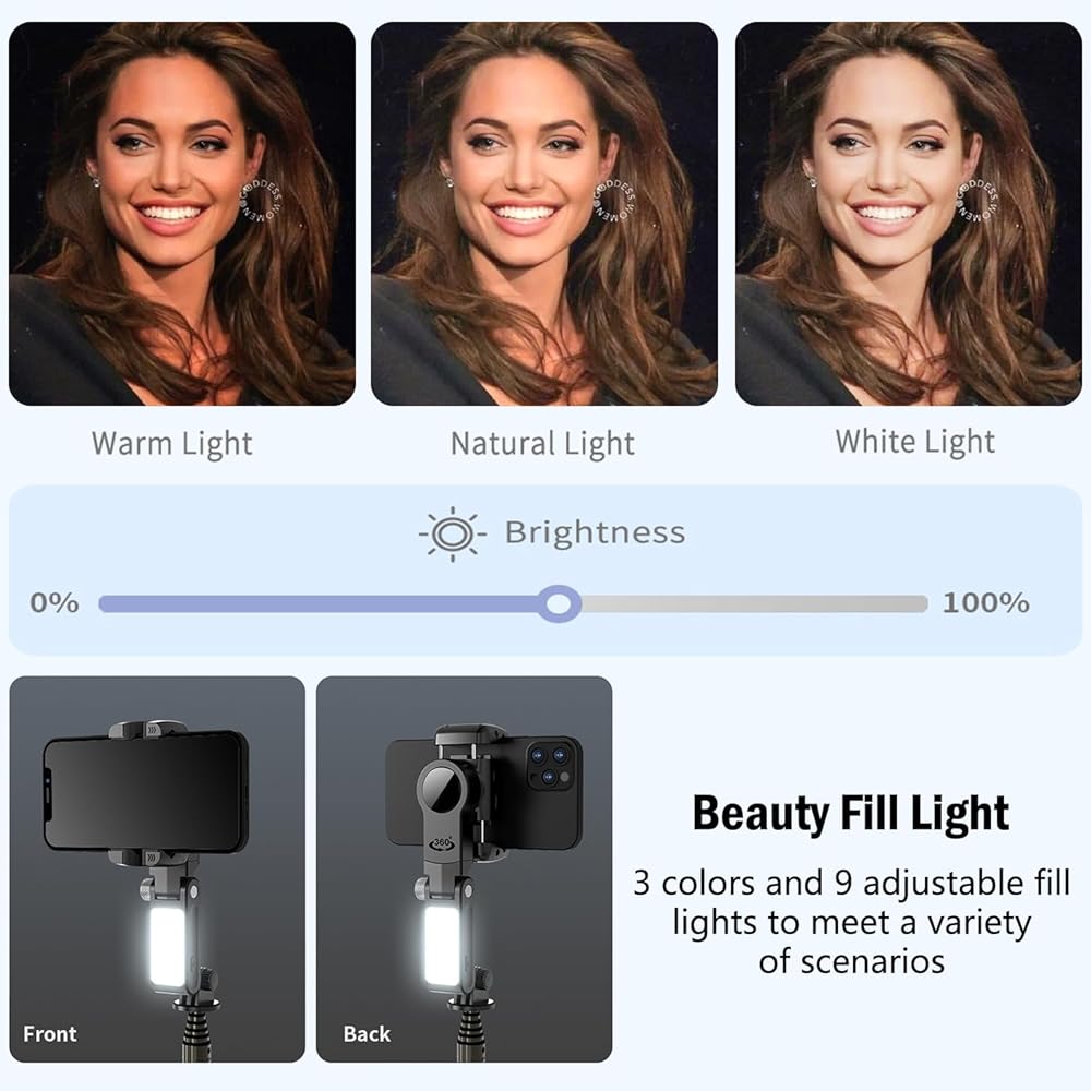 【Mobile Phone Selfie Stick with Light】Retractable aluminum alloy selfie stick with front and back 3 colors and 9 gears adjustable fill light, make your shooting and live broadcast more clear and beautified. The handle can be opened to use as a tripod, and the detachable wireless bluetooth remote control provides you with more convenient shooting.