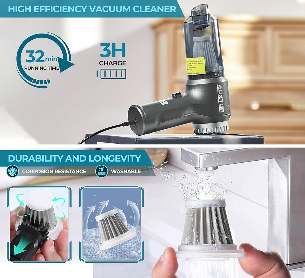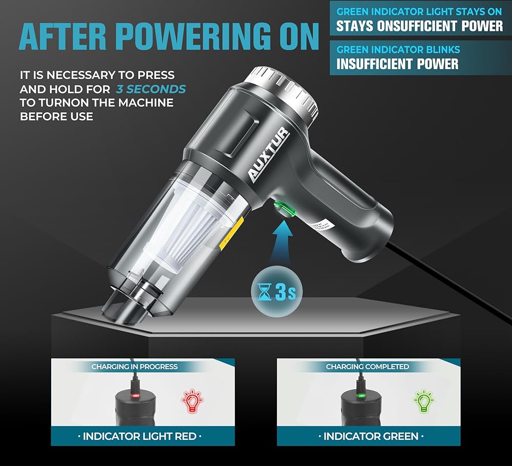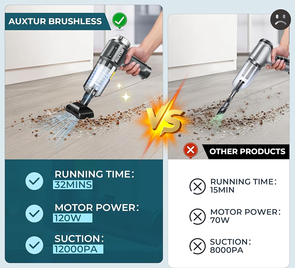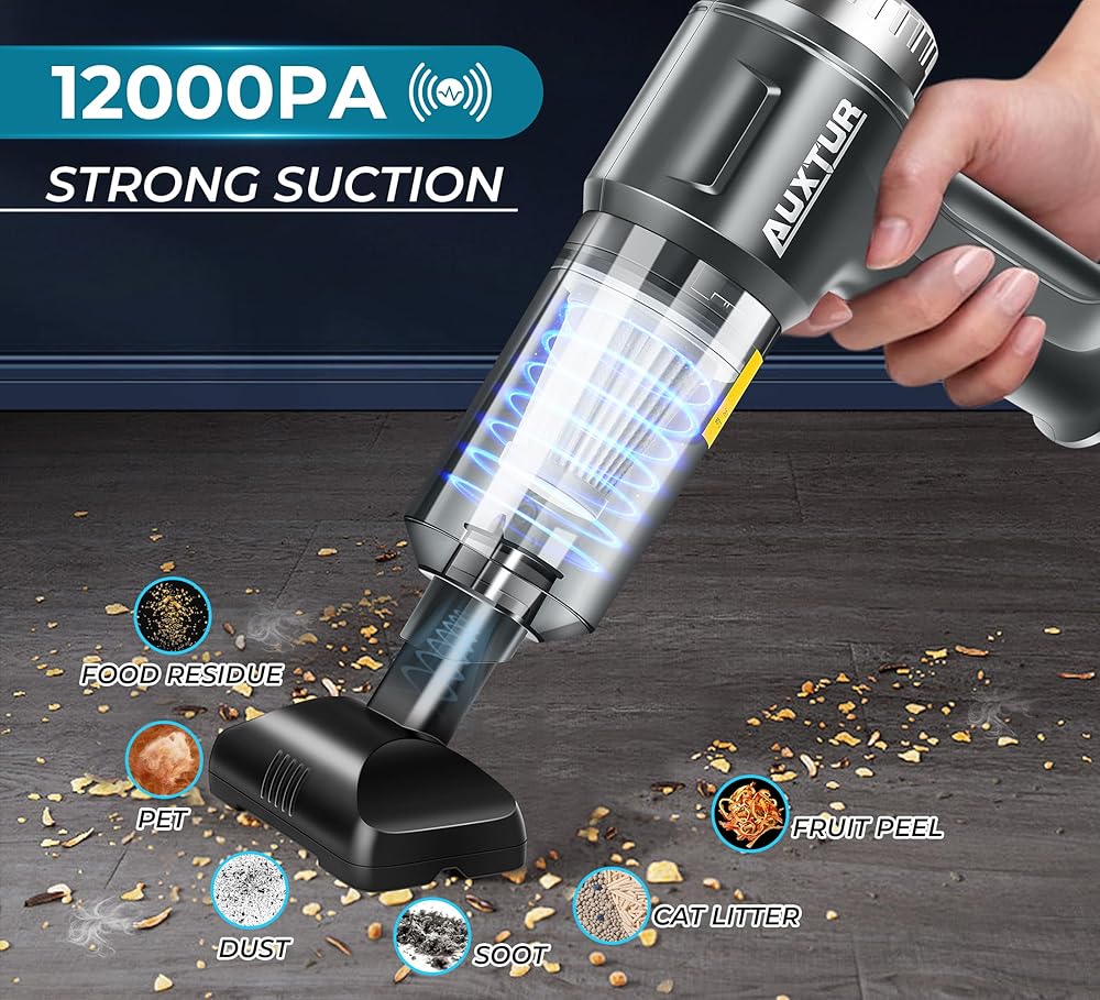 مكنسة كهربائية محمولة باليد من AUXTUR - 3 في 1 مكنسة كهربائية للسيارة، محرك عالي القوة بدون فرش 12000 باسكال، مكانس كهربائية فائقة الشفط - كابل - منظف صغير ومحمول وقابل لإعادة الشحن للسيارة