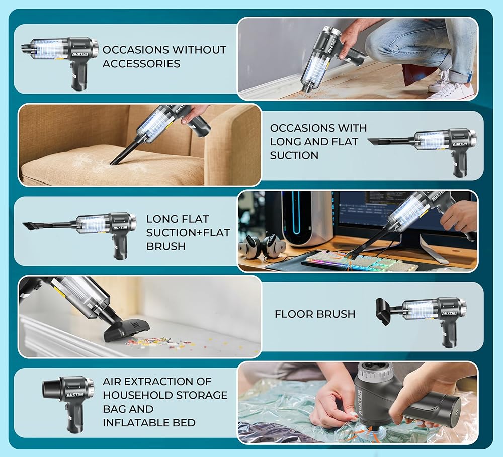 🚗【تصميم متعدد الاستخدامات 3 في 1】ليست مجرد مكنسة كهربائية، يمكن استخدام هذه المكنسة أيضًا كمنفاخ، ومضخة، ومكنسة كهربائية للسيارة عالية الطاقة، ومكنسة كهربائية صغيرة، ومجموعة تنظيف السيارة. قل وداعًا للأدوات المتعددة واستمتع براحة جهاز واحد متعدد الاستخدامات. سواء كنت بحاجة إلى منظف سجاد محمول، أو مكنسة كهربائية خفيفة الوزن، أو مكنسة كهربائية للمراتب، أو آلة تنظيف الأريكة، أو حتى منظف للأسطح، فإن هذا المنظف 3 في 1 يوفر لك كل ما تحتاجه.
