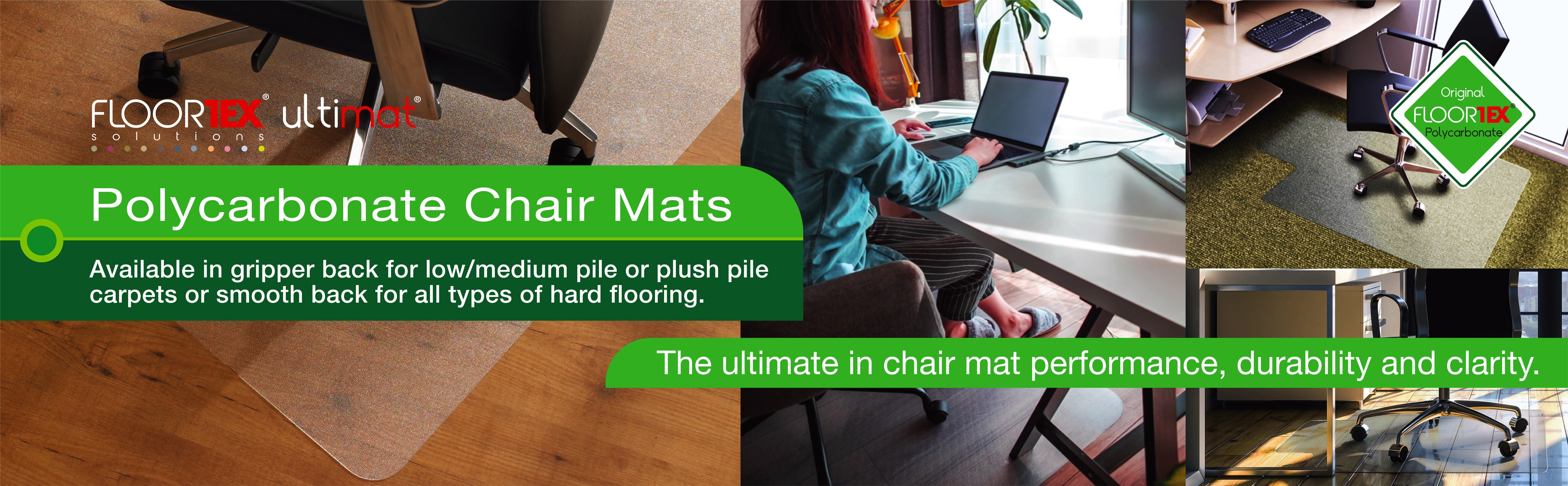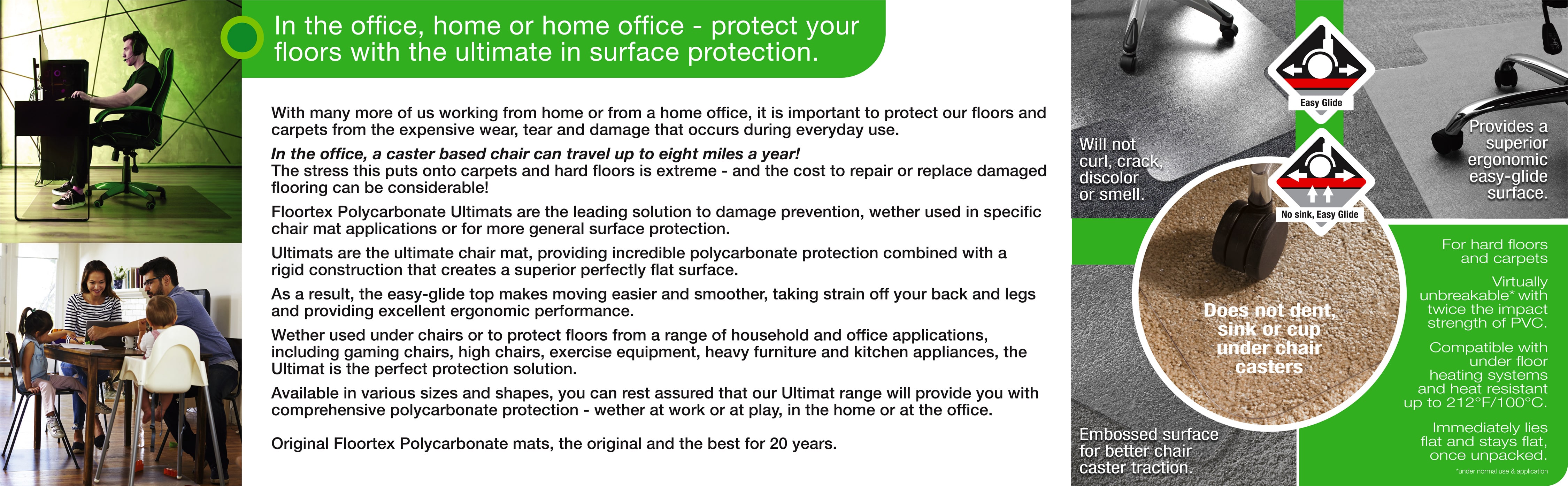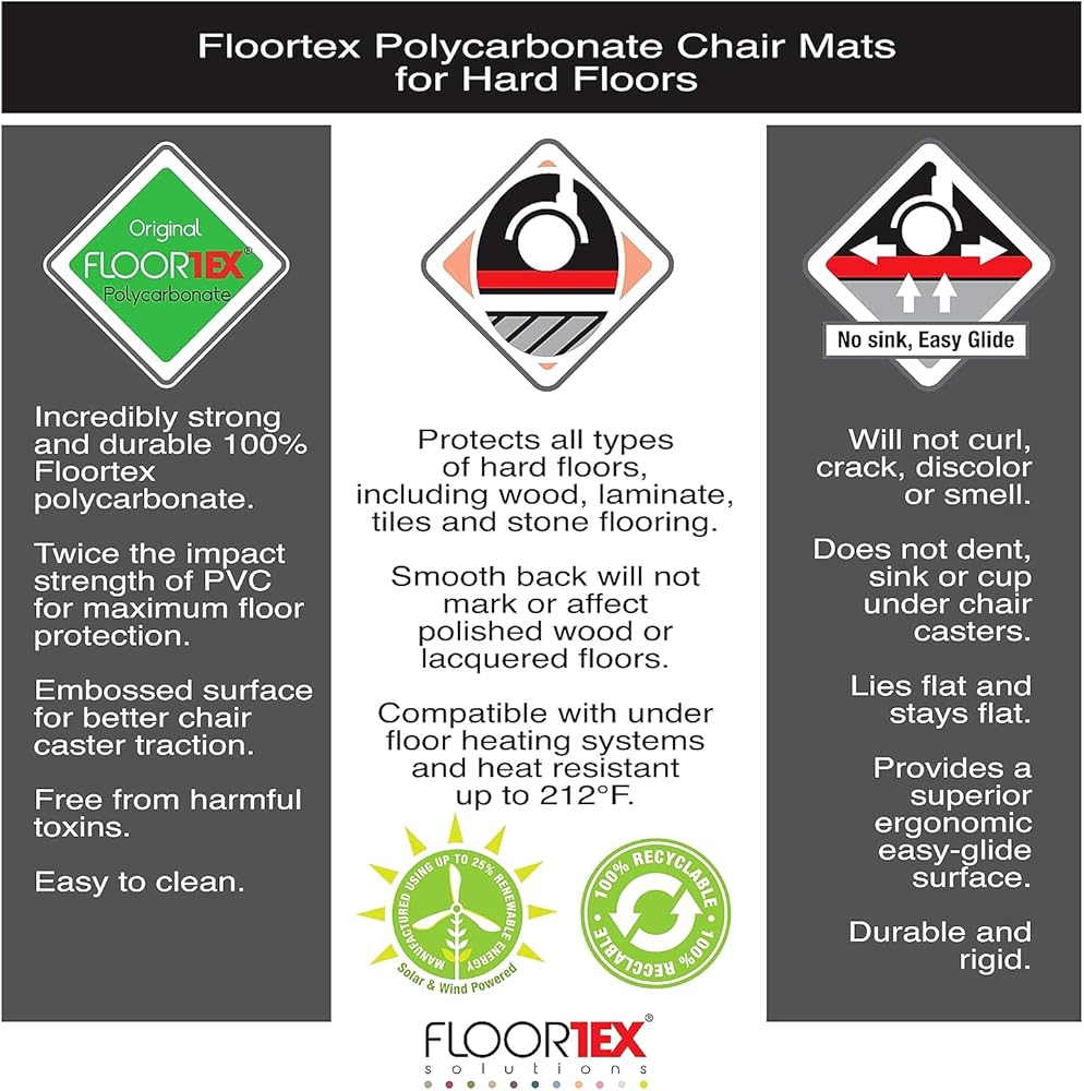 Floortex Original Polycarbonate chair mats provide the ultimate quality, durability and clarity. Twice the impact strength of vinyl to provide a perfect easy glide ergonomic surface for caster based chairs. Polycarbonate will not curl, crack, dimple, discolor or smell under normal use. High clarity allows the beauty of flooring to shine through. Manufactured using 25% renewable energy. Smooth back for hard floors.