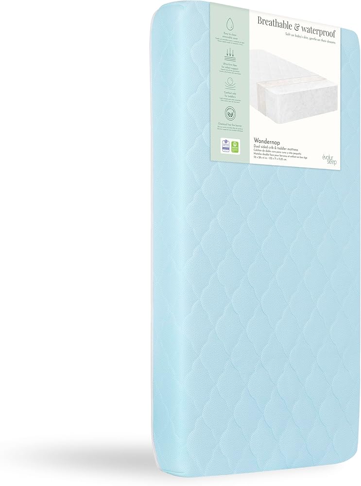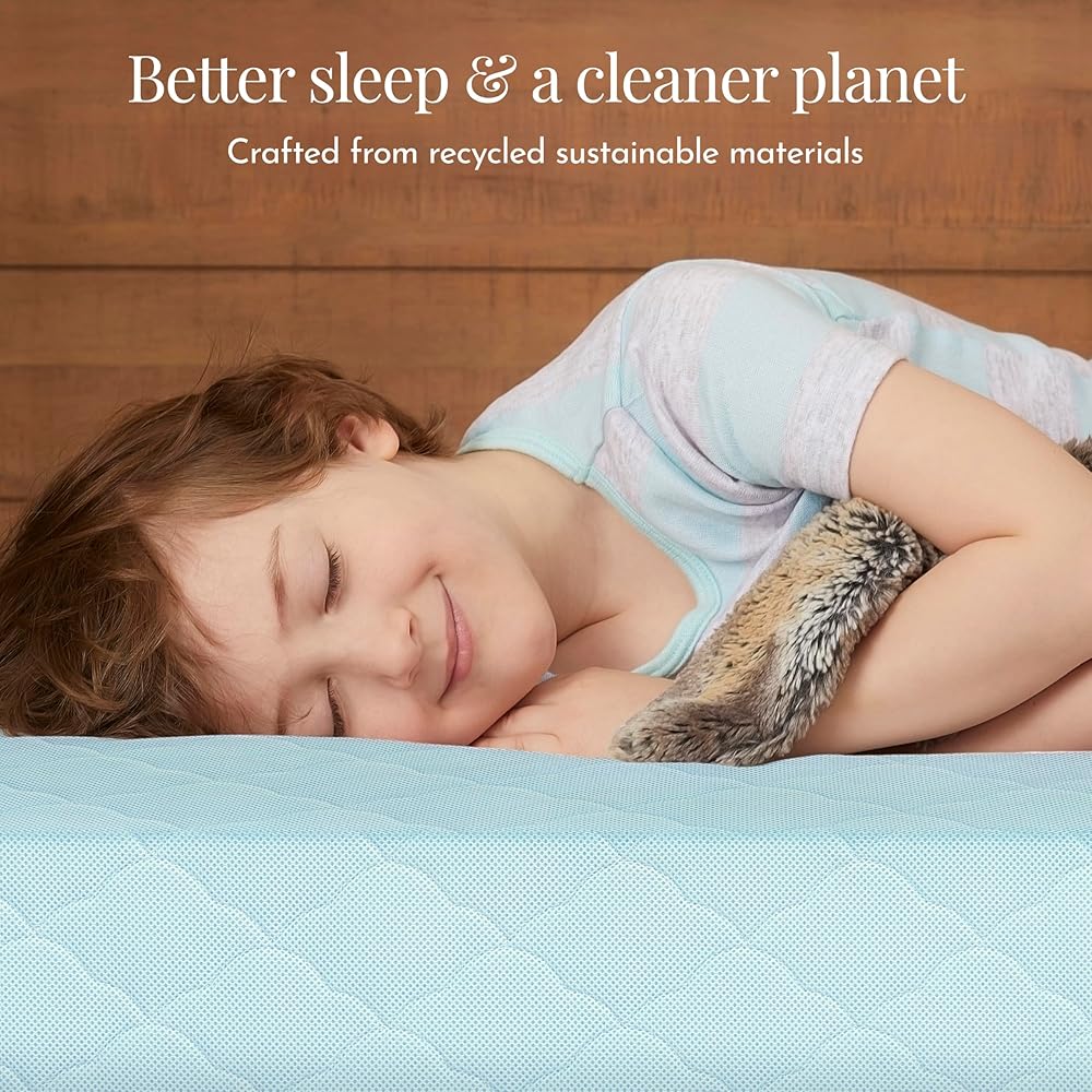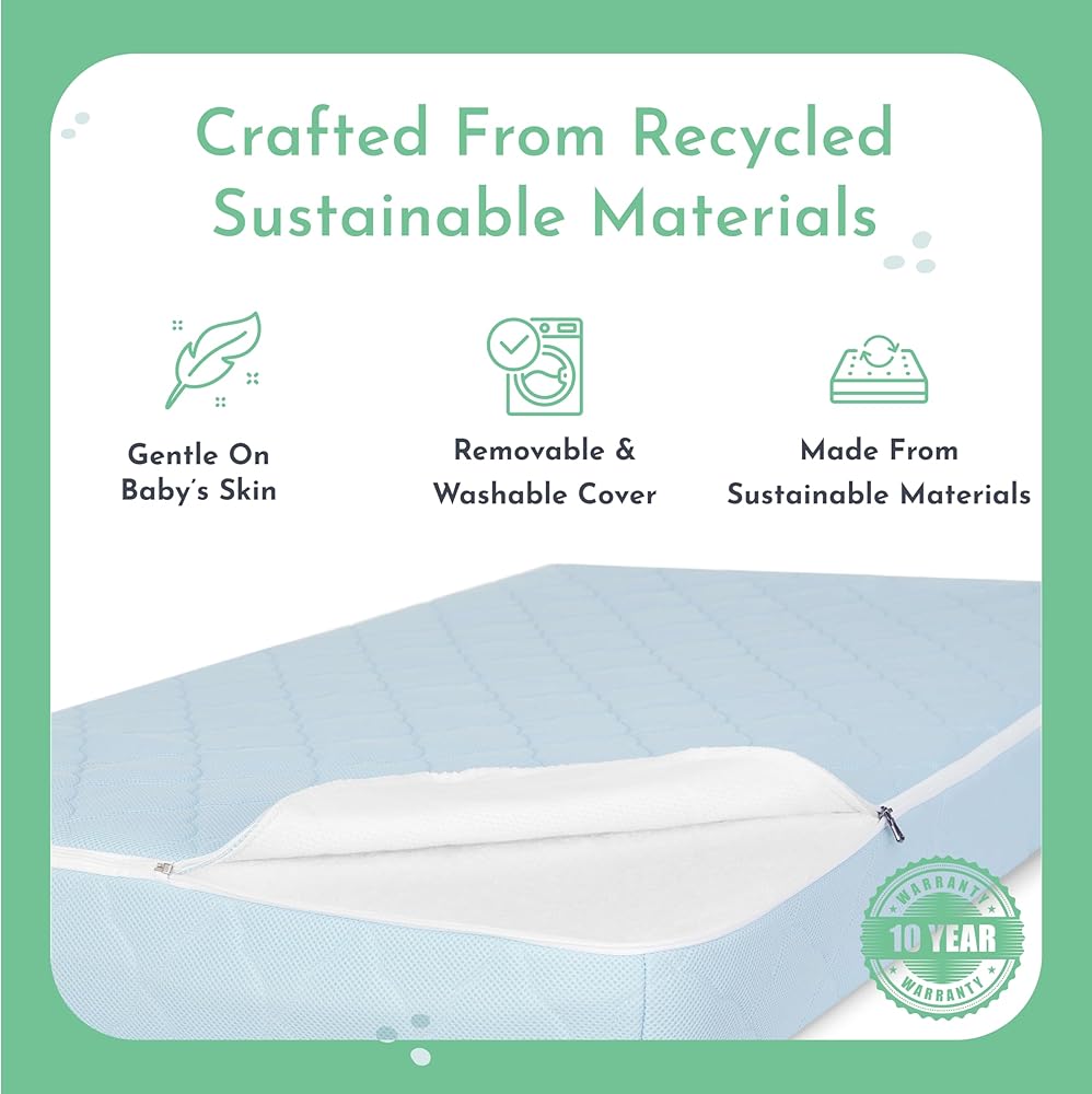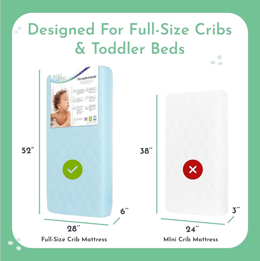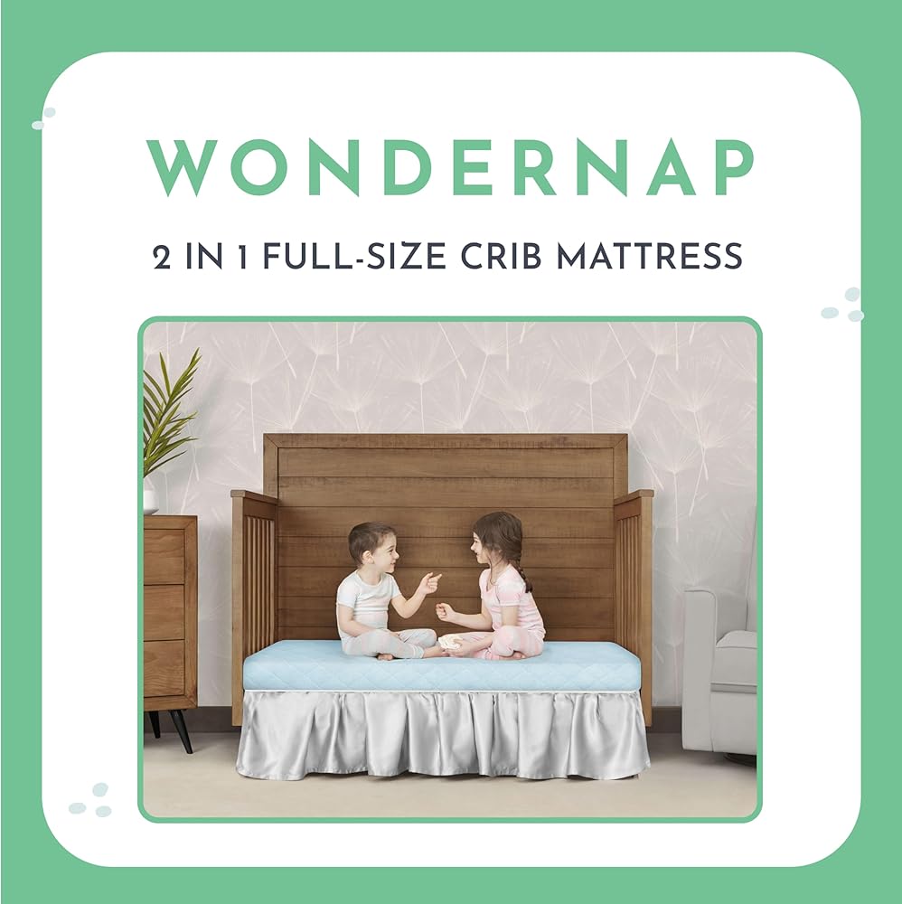 SUSTAINABLE & BREATHABLE: Evolur Wondernap 2 in 1 Full-size Crib Mattress' core is crafted from recycled sustainable materials, ensuring a green choice for your nursery. The breathable core allows increased air flow, keeping the sleep surface fresh and clean for a peaceful night's rest