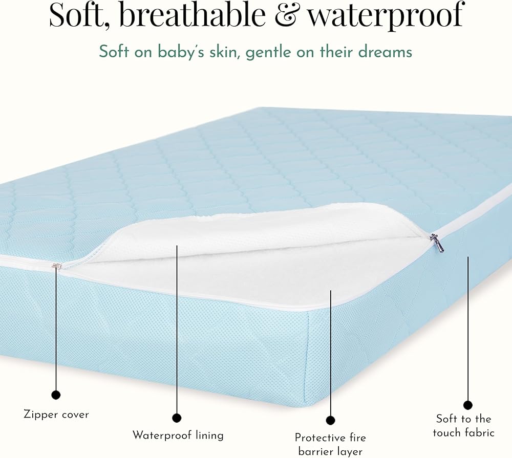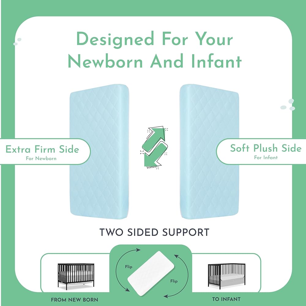 DOUBLE THE COMFORT: Designed for your newborn and infant, our 2-in-1 dual-sided mattress offers the perfect balance of support and comfort. The extra-firm newborn side provides optimal support, while the plush comfort side is gentle and cozy for your growing infant