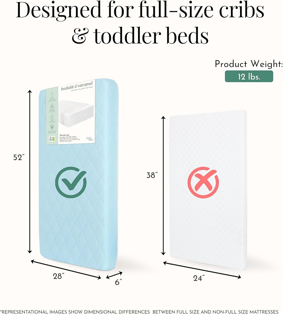 Welcome your bub to the sweetest dreams and the gentlest care. Introducing the Evolur Wondernap 2 in 1 Full-size Crib Mattress - your baby's ultimate sleep haven! Designed for your infant and Toddler our 2-in-1 dual-sided mattress offers the perfect balance of support and comfort. The extra-firm newborn side provides optimal support, while the plush comfort side is gentle and cozy for your growing infant. Evolur Wondernap 2 in 1 Full-size Crib Mattress core is crafted from recycled sustainable materials, ensuring a green choice for your nursery. The breathable core allows increased air flow, keeping the sleep surface fresh and clean for a peaceful night's rest. This thoughtfully designed mattress is JPMA and Greenguard Gold Certified, meeting the strictest safety standards for your peace of mind. The Evolur Wondernap 2 in 1 Full-size Crib Mattress comes with a removable and washable cover, ensuring a hygienic sleep environment. Offering a perfect balance of firmness and coziness, this must-have mattress also comes in 3 soft finishes - White, Pink & Blue. Product dimensions are 52” L x 28” W x 6” H, with a weight of 12 Lbs.