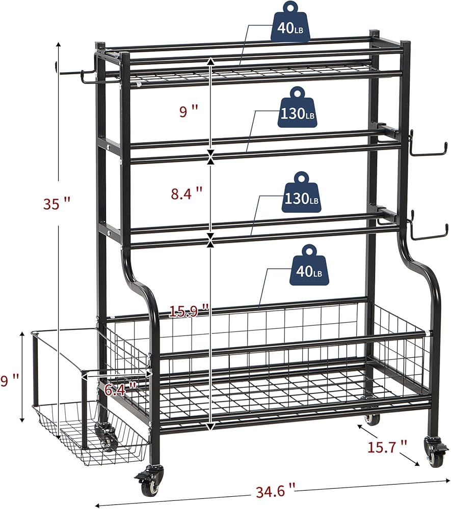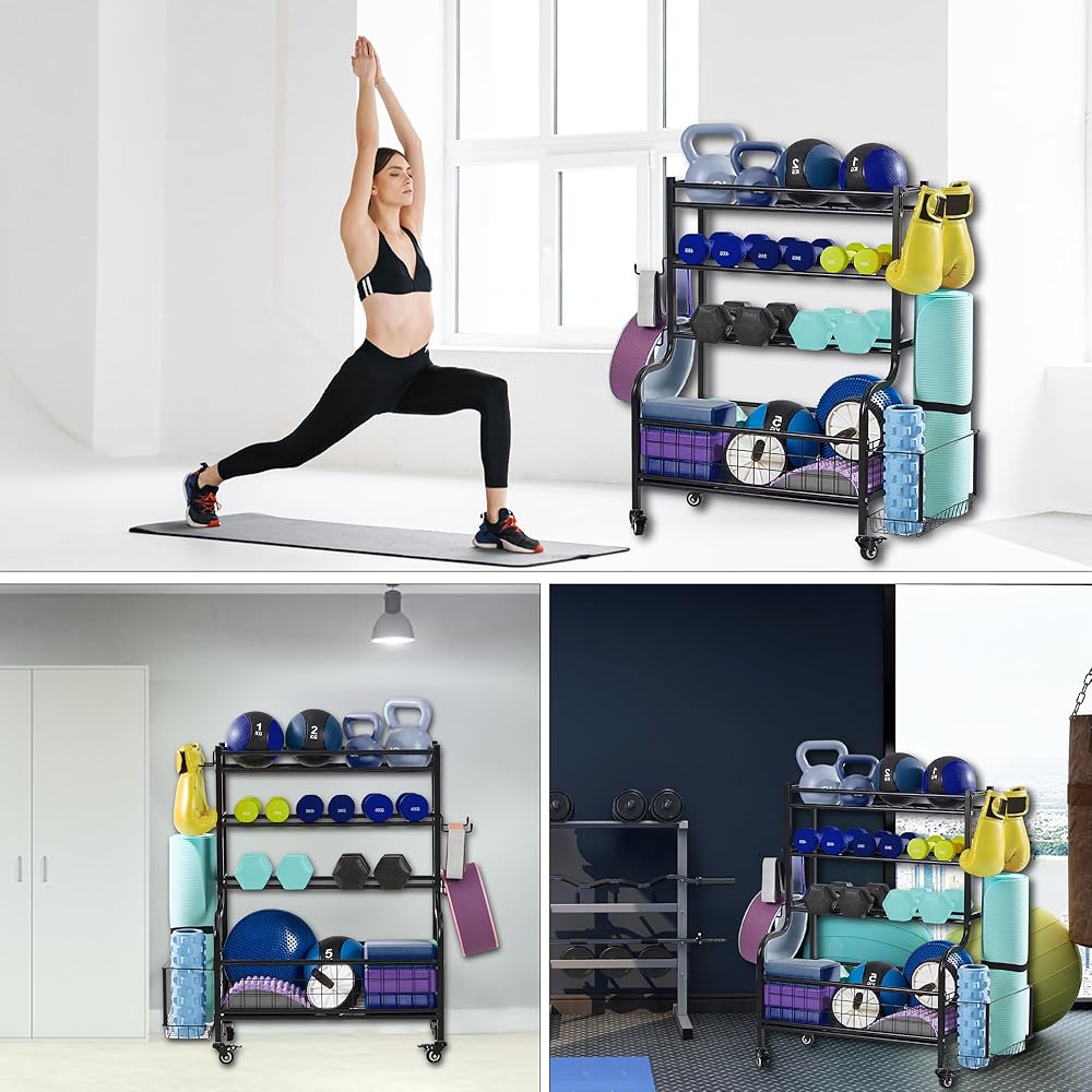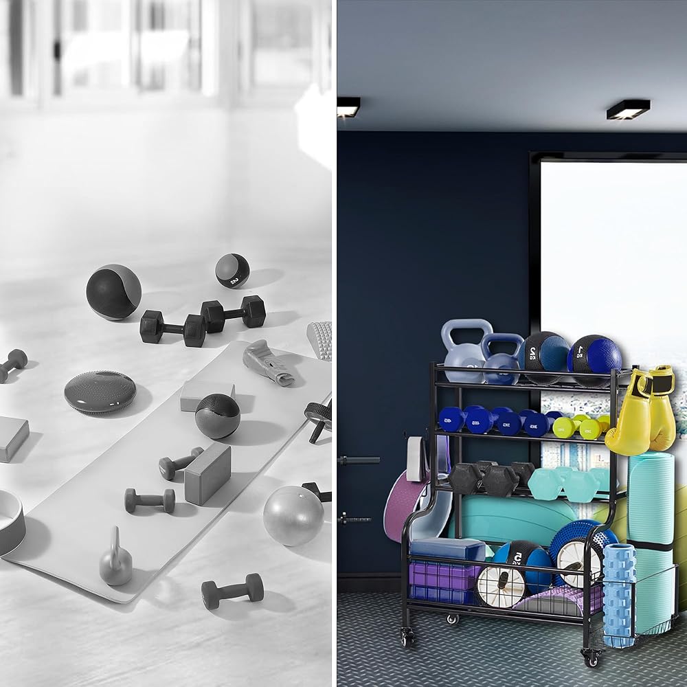 سعة كبيرة جدًا - مجهزة بـ 3 رفوف تخزين، وسلة جانبية مثالية للحصائر وبكرات الرغوة، وشماعات تخزين جانبية لتخزين أشرطة المقاومة والمزيد. الرف السفلي مثالي لتخزين الكرات ومكعبات اليوغا والمزيد