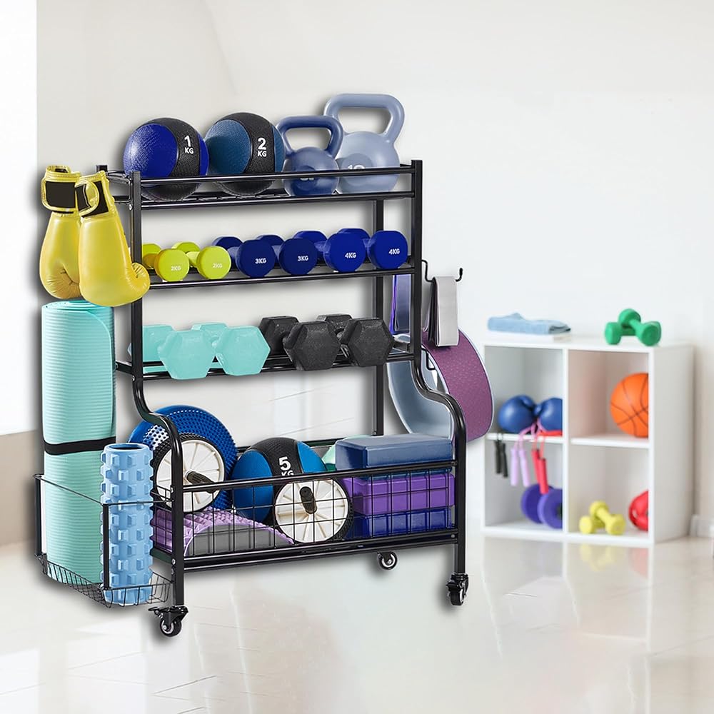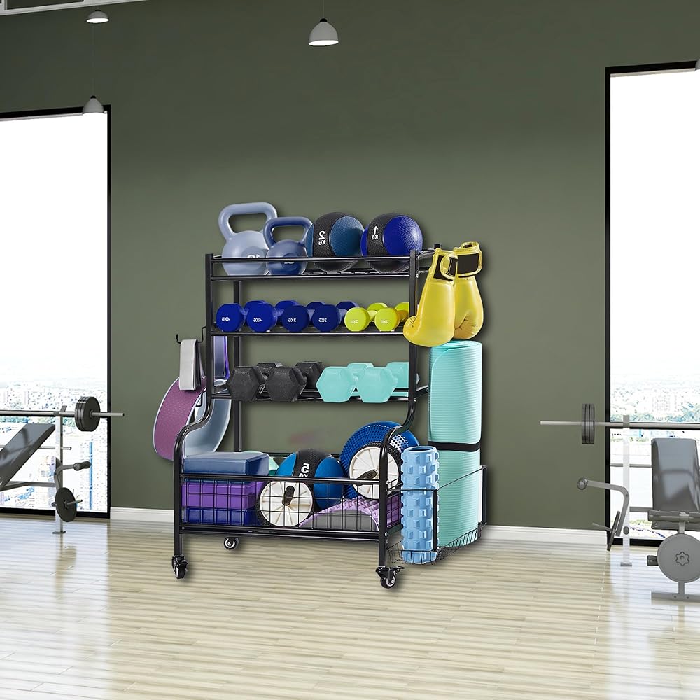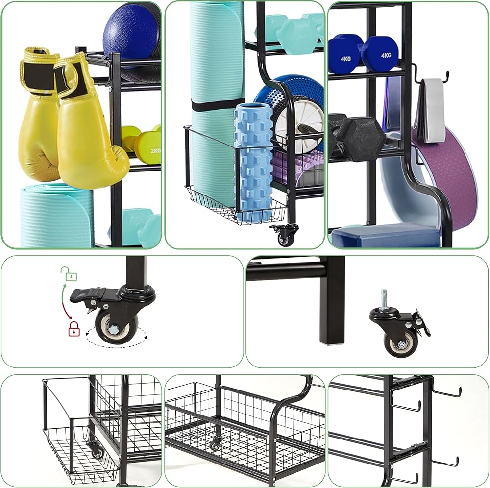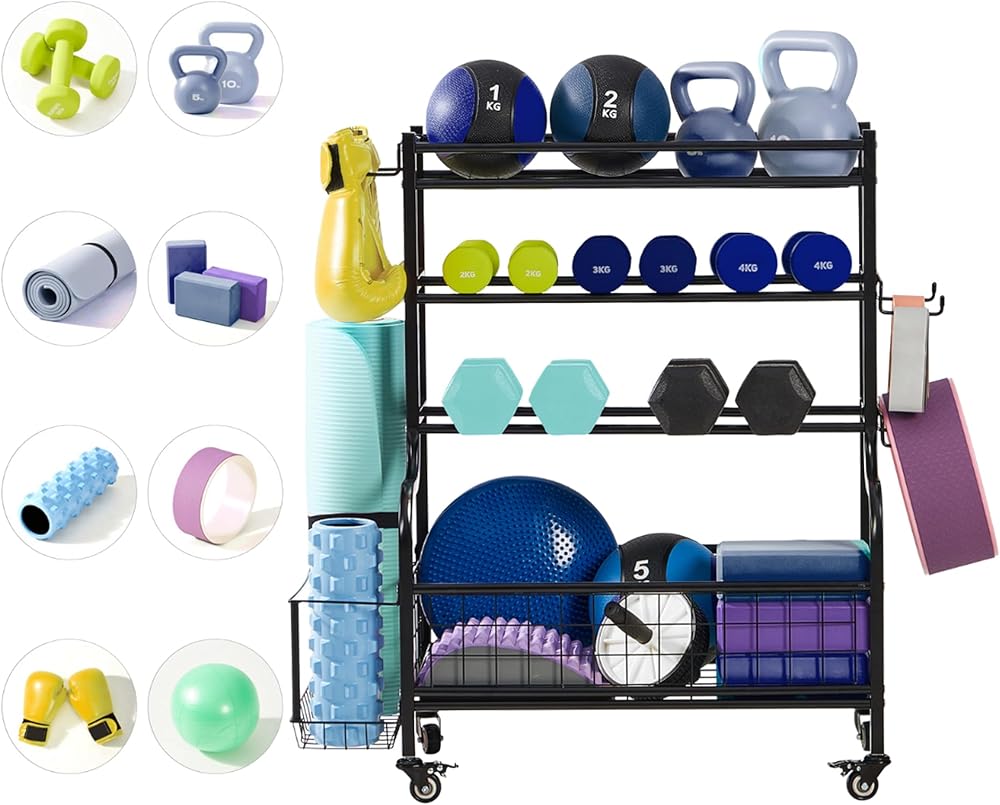 رف تخزين الدمبل من لوجو وحامل مع عجلات وخطافات، حامل ثقيل للوزن للدمبل وكرات كيتلبول وحصيرة اليوجا والكرات، وتخزين صالة الألعاب الرياضية المنزلية، وتخزين الكل في واحد للتمرين، لمسة نهائية من الفولاذ