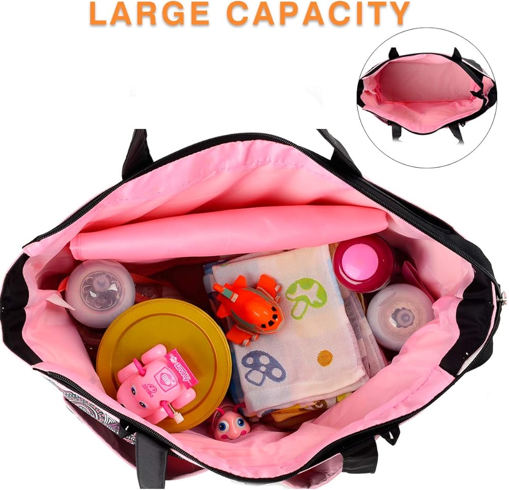 واسعة ومنظم - قم بتنظيم وحمل جميع مستلزمات العناية بالطفل بشكل مرتب باستخدام جيوب متعددة وكن مجهزًا جيدًا لإطعام الطفل بسهولة وتغيير الحفاضات بشكل صحي وتخزين الملابس المبللة وما إلى ذلك. توفر مجموعة حقائب الحفاضات هذه سعة كبيرة دون أن تصبح ضخمة.