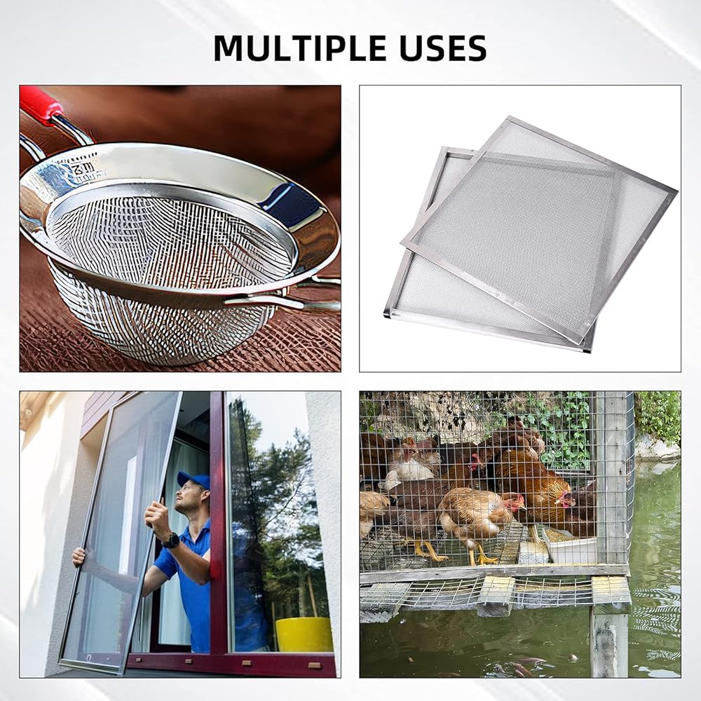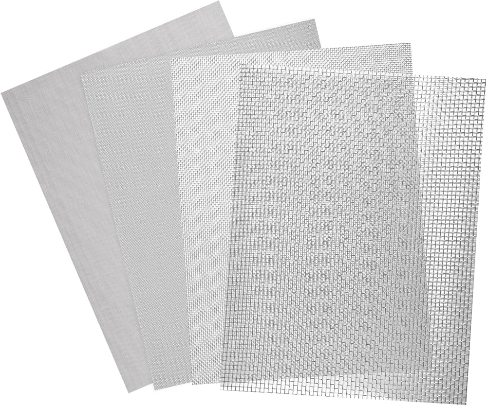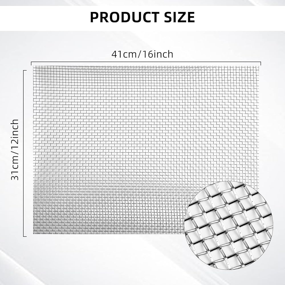 حجم المنتج والعبوة - 12 بوصة × 16 بوصة (31 سم × 41 سم)، 50 شبكة، الفتحة 0.393 مم/0.015 بوصة، قطر السلك 0.23 مم/0.009 بوصة؛ تغليف سليم، غير قابل للطي (تبقى الشاشة السلكية مسطحة)، قطعتان من شبكة سلكية منسوجة.
