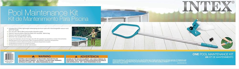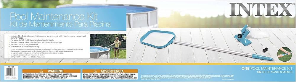 Keep your Intex pools clean and fresh with Intex Pool Maintenance Kit. Kit includes 94in telescoping aluminum shaft for use with 16ft and below pools. Also includes interchangeable vacuum and skimmer heads to collect debris from pool and keep it nice and cleanludes 94in telescoping aluminum pole for use with 16ft and below poolsInterchangeable vacuum and skimmer heads