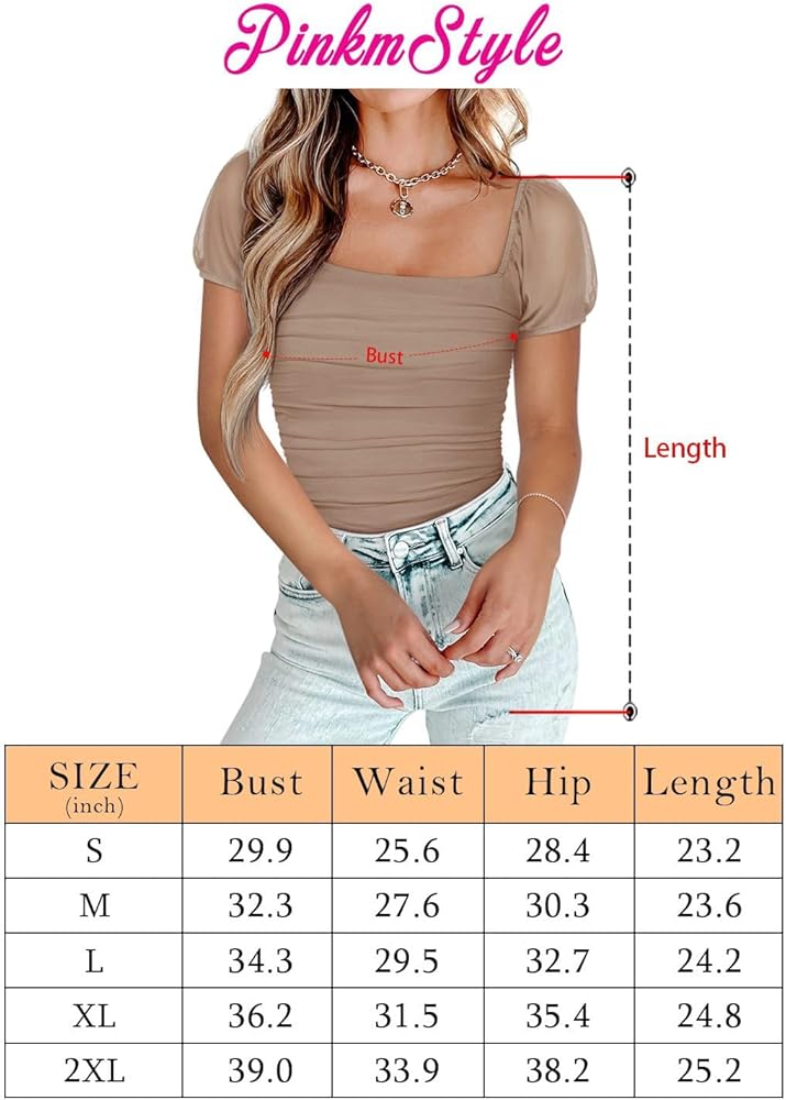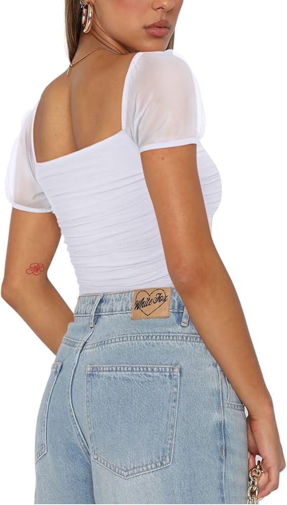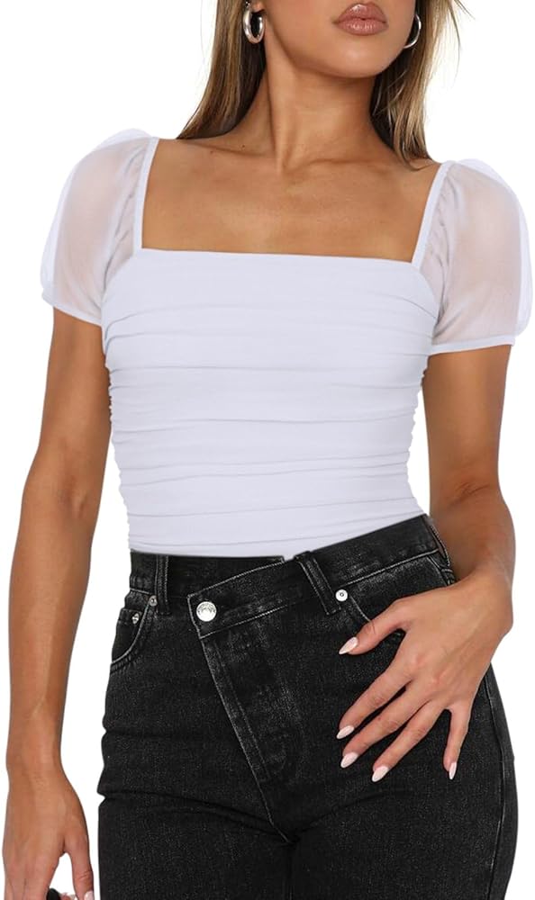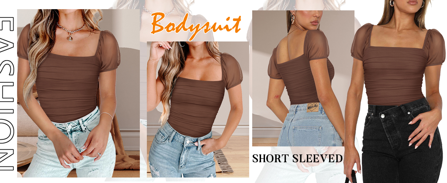 PINKMSTYLE Women's Square Neck Mesh Short Sleeve Bodysuit Sexy Sheer Tops Date Night Outfit