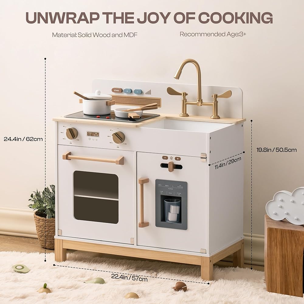 • 🌈 مطبخ لعب عملي 🍦 ارفع مستوى وقت اللعب مع مطبخ اللعب الخشبي المستوحى من مونتيسوري! تصميم أنيق باللون الأبيض، ومقابض خشبية، وصنبور معدني لامع ينقل طفلك إلى عالم من الإبداع. الموقد، مع الأضواء والأصوات، يضفي متعة الطبخ على الحياة. بالإضافة إلى ذلك، يضيف صانع الثلج المدمج لمسة رائعة للعب الخيالي الذي لا نهاية له!