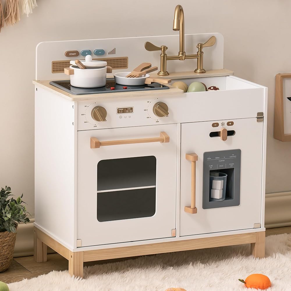 مطبخ اللعب للأطفال الصغار من روبوتيم، مجموعة ألعاب المطبخ الخشبية للأطفال مع أضواء وأصوات حقيقية/موزع مكعبات الثلج، مطبخ لعبة مونتيسوري التظاهري، هدية للأعمار من 3 سنوات فما فوق (أبيض)