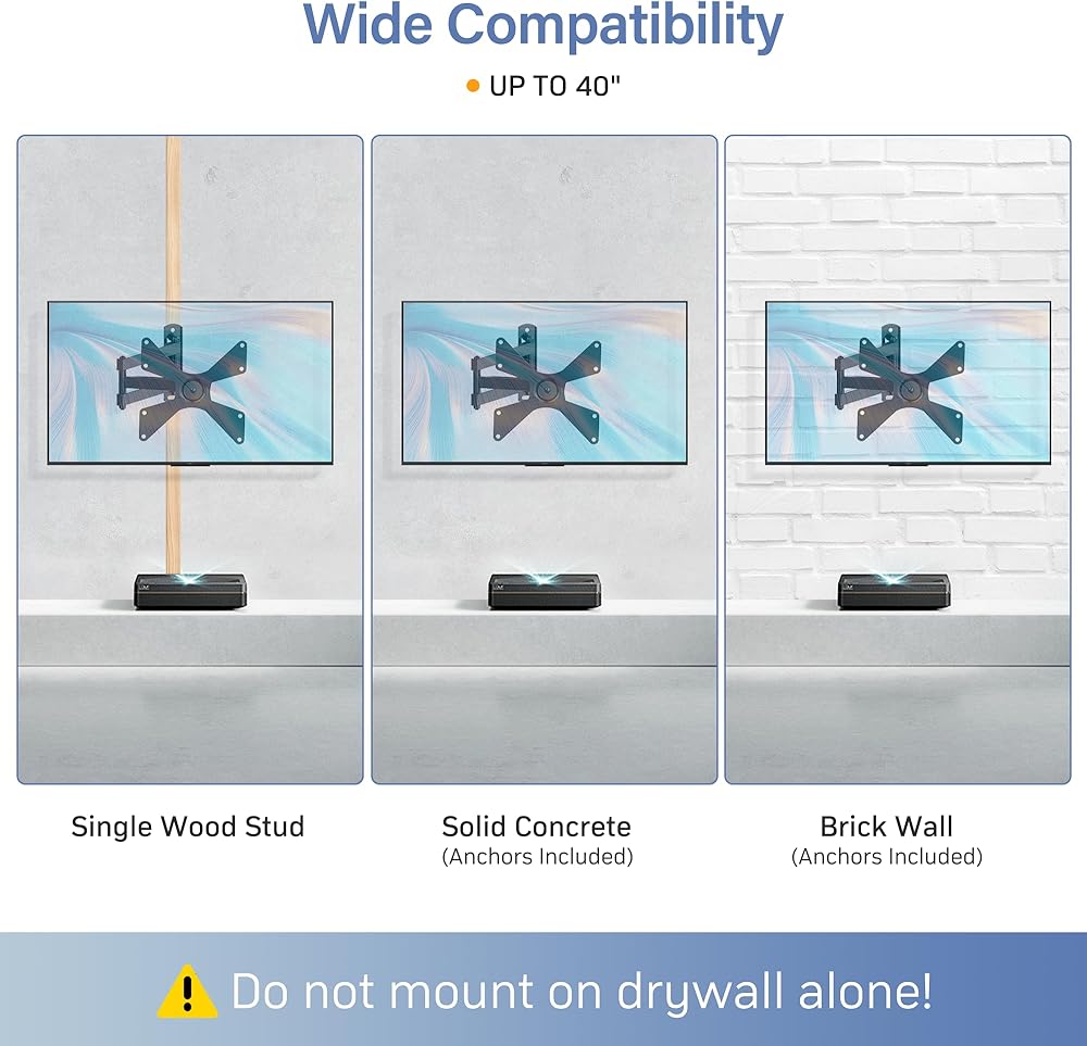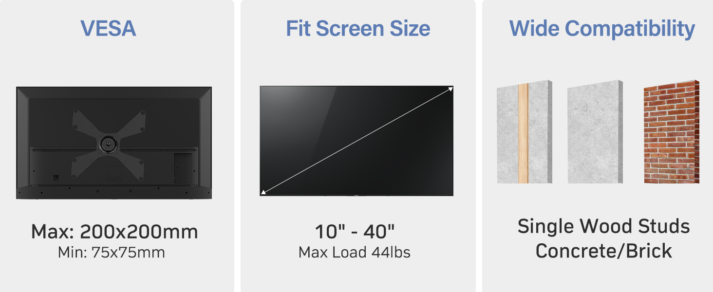 • توافق حامل التلفزيون - حامل التلفزيون على الحائط يناسب SAMSUNG، SONY، LG، VIZIO، TCL، ELEMENT، SCEPTRE، HISENSE وغيرها من العلامات التجارية للتلفزيون مع حجم الشاشة من 10 بوصة إلى 40 بوصة وما يصل إلى 44 رطلاً (20 كجم)، يناسب المسافات بين أنماط التثبيت VESA من 75 × 75 ملم إلى 200 × 200 ملم.