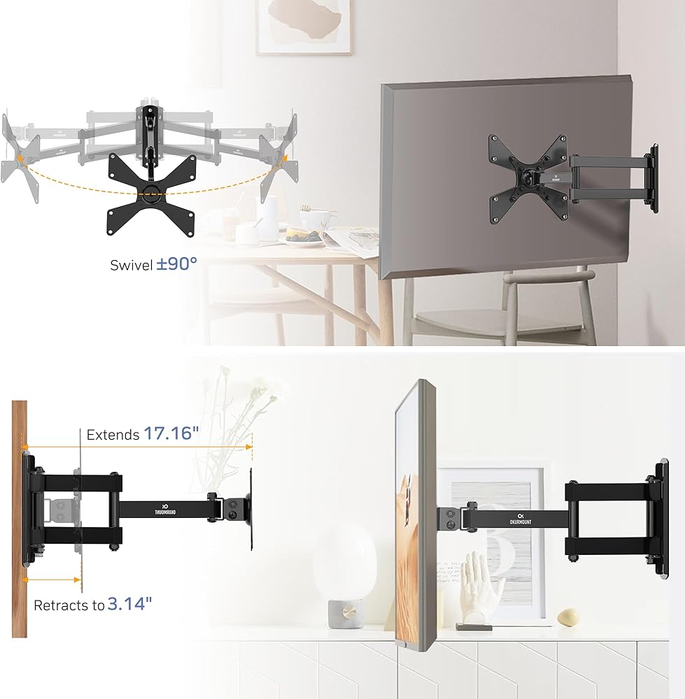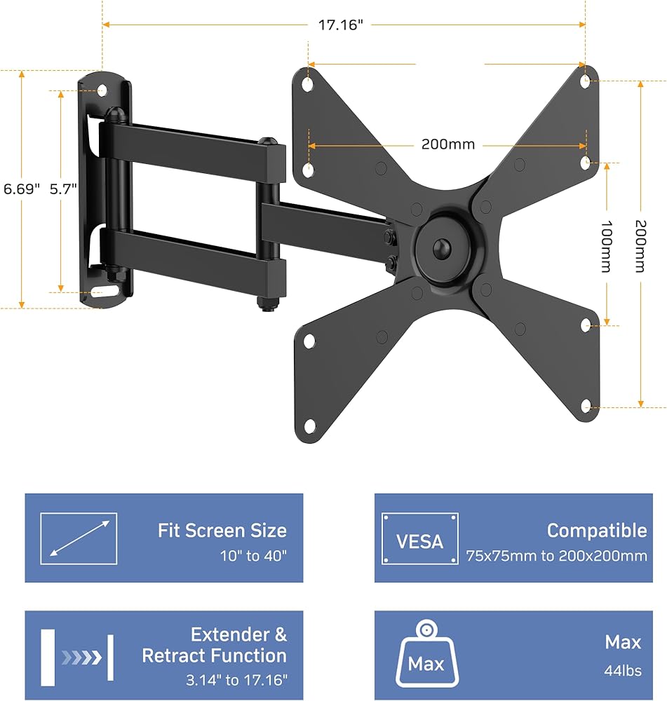 • وظيفة الموسع والسحب - حامل الحائط التلفزيوني المفصلي هذا بذراع يسحب 3.14 بوصة من الجدار لتوفير الراحة خارج الطريق بالإضافة إلى أقصى امتداد 17.16 بوصة من الجدار.