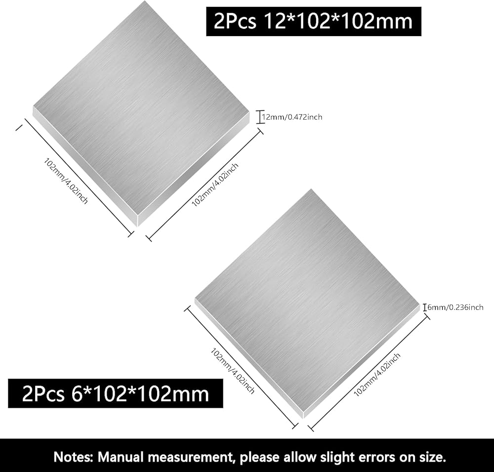 Package Include:You will get 2Pcs 12mm(0.472")Thickness X 102mm(4.02")Width X 102mm(4.02")Length,and 2Pcs 6mm(0.236")Thickness X 102mm(4.02")Width X 102mm(4.02")LengthLength Aluminum Plate.